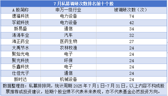 7月A股震荡走强,结构性机会不断涌现,私募机构调研热情高涨,为后市布局积极"探路"。 第三方机构最新监测数据显示,7月共有657家私募证券管理人参与A股上市公司调研,覆盖358只个 股,合计调研1763次。从行业到个股,科技成长领域成为调研焦点。 7月私募调研呈现明显的头部集中效应。第三方机构私募排排网监测数据显示,7月52只个股获得不少于 10次调研,其中前十名个股(含并列排名,下同)均被调研至少24次。 电力设备龙头德福科技以74次调研领先,远超其他个股,该股在7月吸引了聚鸣投资、睿郡资产等众多 百亿私募扎堆关注。另一只电力设备股孚能科技以42次调研位居第二。通信行业的新易盛(34次)、汽 车行业的涛涛车业(32次)以及医药生物行业的海正药业(27次)进入前五。此外,农林牧渔、电子、 环保、机械设备等行业均有个股跻身前十。 | | 7月私募调研次数排名前十个股(含并列排名) | | | --- | --- | --- | | A 股简称 | 申万一级行业 | 被调研次数(次) | | 德福科技 | 电力设备 | 74 | | 孚能科技 | 电力设备 | 42 | | 新易盛 | 通信 | 34 | | 涛 ...