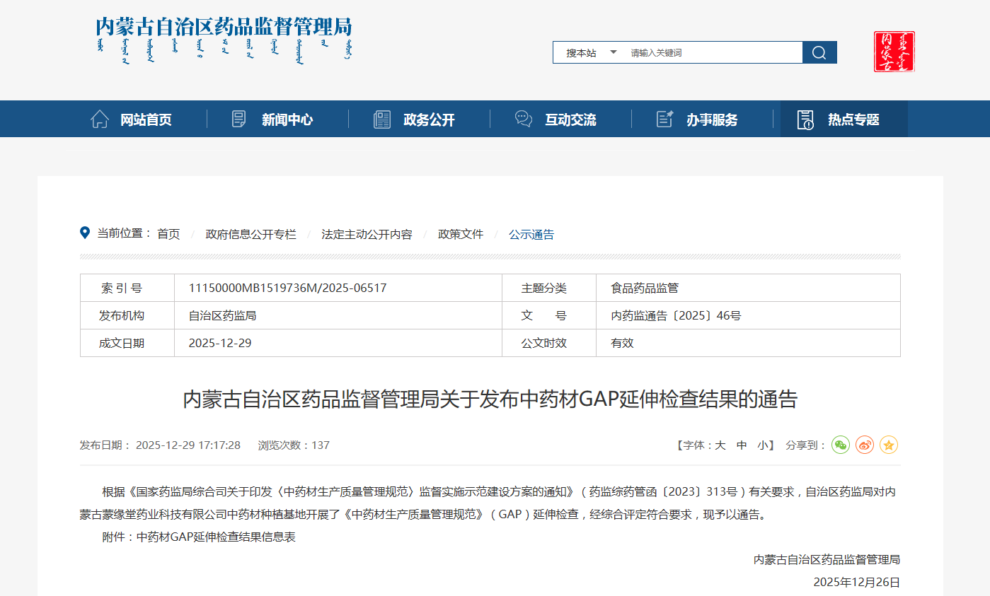 内蒙古自治区药品监督管理局关于发布中药材GAP延伸检查结果的通告_ 内蒙古自治区药品监督管理局 | 索引 号 | 11150000MB1519736M/2025-06517 | 主题分类 | 食品药品监管 | | --- | --- | --- | --- | | 发布机构 | 自治区药监局 | 文 부 | 内药监通告〔2025〕46号 | | 成文日期 | 2025-12-29 | 公文时效 | 有效 | | 企业名称 | 产品 | 中药 材 | 中药材生产企业 | 基地地址 | 种植面积 | 年产量约 | 检查 | | --- | --- | --- | --- | --- | --- | --- | --- | | | 名称 | | | | (亩) | (吨) | 结果 | | | | 品种 | | | | | | | 内蒙古蒙缘堂药业科技 | 桔梗 | 桔梗 | 内蒙古蒙缘堂药业科技 | 赤峰市元宝山区美丽河镇前美丽河村(东经 | 1115 | 300 | 符合 | | 有限公司 | 饮片 | | 有限公司 | 119.17410474,北纬42.08394692) | | | 要求 | 根据《国家药 ...