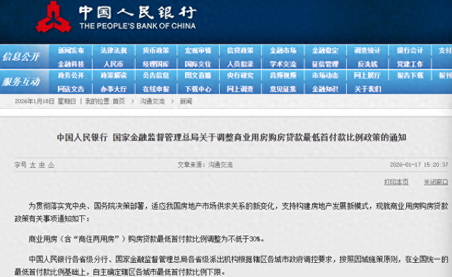 政策调整 - 中国人民银行与国家金融监督管理总局联合发布通知,将商业用房(含“商住两用房”)购房贷款最低首付款比例调整为不低于30% [1] - 政策调整于1月17日发布 [1] 执行细则 - 中国人民银行各省级分行及国家金融监督管理总局各省级派出机构有权根据辖区各城市政府调控要求,在30%的全国统一最低首付款比例基础上,自主确定辖区各城市的最低首付款比例下限 [1] - 政策执行遵循因城施策原则 [1]