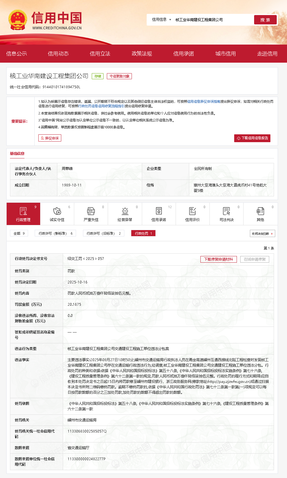 | | | 近日,齐鲁晚报·齐鲁壹点记者从信用中国获悉,核工业华南建设工程集团公司因交通建设工程施工单位违法分包案,被嵊州市交通运输局罚款20.1675万 元。 违法事实为:2025年08月27日10时50分,嵊州市交通运输局行政执法人员在甬金高速嵊州互通西接线北延工程检查时发现核工业华南建设工程集团公司存在 交通运输行政违法行为,经调查,核工业华南建设工程集团公司交通建设工程施工单位违法分包。 信用信息 ▼ 核工业华南建设工程集团公司 搜索 信息公示 信用立法 政策法规 城市信用 走进信用 信用动态 信用承诺 核工业华南建设工程集团公司 [ 薛 守信激励对象 统一社会信用代码: 91440101741894750L 1.如认为所展示信息存在错误、遗漏、公开期限不符合规定以及其他侵犯信息主体合法权益的,可按照信用信息异议审诉指南提出异议审诉,如需对相关行政处罚 信息进行信用修复,可按照行政处罚信息信用修复流程指引提出信用修复申请, 2.本查询结果仅依现有数据展示相关信息,供社会参考使用。使用相关信息的单位和个人应对信息使用行为的合法性负责。 3."信用中国"网站公示信息与认定单位公示信息不一致的,以认定单位相 ...