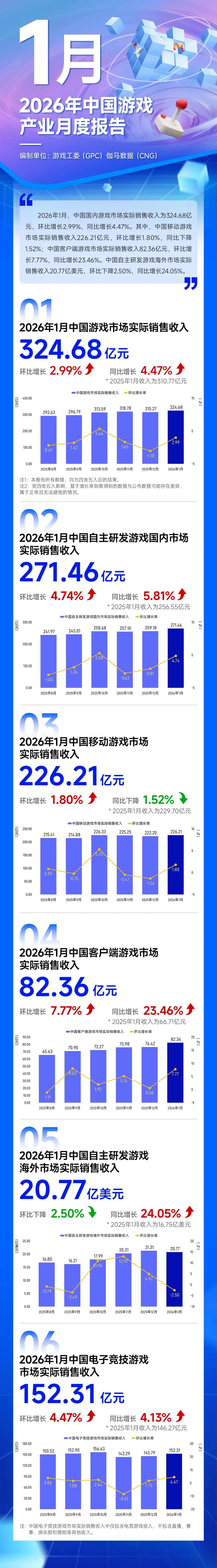 2026年1月中国游戏市场整体表现 - 2026年1月中国国内游戏市场实际销售收入为324.68亿元,环比增长2.99%,同比增长4.47% [1][3] - 2025年1月中国国内游戏市场实际销售收入为310.77亿元 [3] - 从2025年8月至2026年1月,月度收入呈现波动上升趋势,从292.63亿元增长至324.68亿元,期间环比增长率最高为5.66%(2025年9月),最低为-1.10%(2025年11月)[4] 移动游戏市场表现 - 2026年1月中国移动游戏市场实际销售收入为226.21亿元,环比增长1.80%,但同比下降1.52% [1][8] - 2025年1月中国移动游戏市场实际销售收入为229.70亿元 [8] - 从2025年8月至2026年1月,月度收入在214.88亿元至226.33亿元之间波动,期间环比增长率最高为5.33%(2025年9月),最低为-1.36%(2025年10月)[9] 客户端游戏市场表现 - 2026年1月中国客户端游戏市场实际销售收入为82.36亿元,环比增长7.77%,同比增长23.46% [1][10][12] - 2025年1月中国客户端游戏市场实际销售收入为66.71亿元 [12] - 从2025年8月至2026年1月,月度收入从65.63亿元增长至82.36亿元,期间环比增长率最高为8.03%(2025年10月),最低为-1.11%(2025年8月)[12] 自主研发游戏市场表现 - **国内市场**:2026年1月中国自主研发游戏国内市场实际销售收入环比增长4.74%,同比增长5.81% [6] - **国内市场**:2025年1月中国自主研发游戏国内市场实际销售收入为256.55亿元 [6] - **国内市场**:从2025年8月至2026年1月,月度收入从241.97亿元增长至271.46亿元,期间环比增长率最高为5.58%(2025年9月),最低为-1.03%(2025年12月)[7] - **海外市场**:2026年1月中国自主研发游戏海外市场实际销售收入为20.77亿美元,环比下降2.50%,但同比增长24.05% [1][13][14][15] - **海外市场**:2025年1月中国自主研发游戏海外市场实际销售收入为16.75亿美元 [14] - **海外市场**:从2025年8月至2026年1月,月度收入从12.91亿美元增长至20.77亿美元,期间环比增长率最高为10.96%(2025年9月),最低为-3.49%(2025年10月)[16] 电子竞技游戏市场表现 - 2026年1月中国电子竞技游戏市场实际销售收入为152.31亿元,环比增长4.47%,同比增长4.13% [17][18][19] - 2025年1月中国电子竞技游戏市场实际销售收入为146.27亿元 [19] - 从2025年8月至2026年1月,月度收入从143.29亿元增长至156.63亿元,期间环比增长率最高为3.86%(2025年10月),最低为-8.51%(2025年8月)[20] - 该收入仅包含电竞游戏收入,不包含直播、赛事、俱乐部和赞助等其他收入 [21]