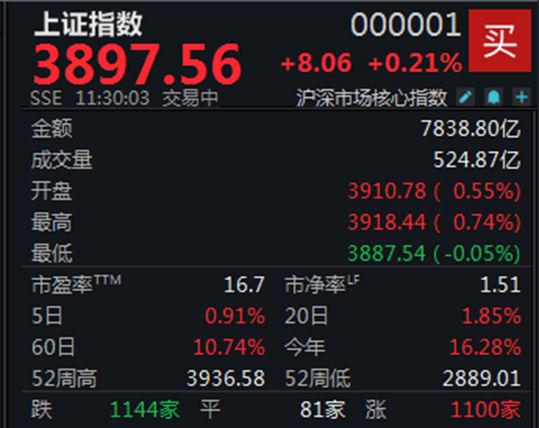 A股冲高回落,沪指半日微涨0.21%