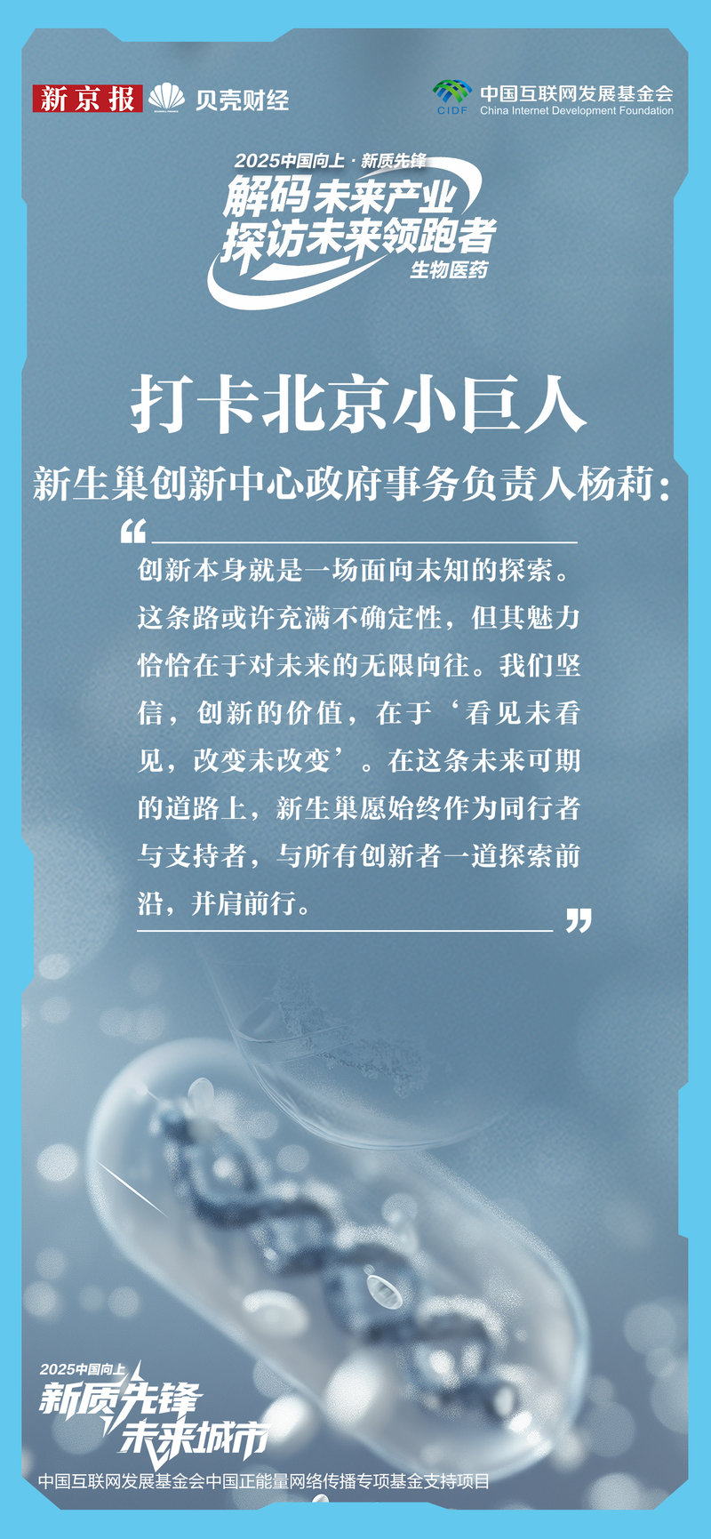新 京 报 √ 贝壳财经 打卡北京小巨人 新生巢创新中心政府事务负责人杨莉: 创新本身就是一场面向未知的探索。 这条路或许充满不确定性,但其魅力 恰恰在于对未来的无限向往。我们坚 信,创新的价值,在于'看见未看 见,改变未改变'。在这条未来可期 的道路上,新生巢愿始终作为同行者 与支持者,与所有创新者一道探索前 沿,并肩前行。 北京市医药健康产业规模在2024年突破万亿元。这一成就得益于"南北联动"的战略布局:南部以国际医药创新公 园和大兴生物医药基地为引擎;北部则以中关村生命科学园为核心,在海淀与昌平建设包括国际医疗器械城在内 的多个前沿集聚区,旨在打造原始创新策源地。 这一系列布局精准呼应了国家与城市层面关于发展新质生产力、推动重点产业集群升级的战略指引,特别是"十五 五"规划中对医药健康等优势产业的强调。 (中国互联网发展基金会中国正能量网络传播专项基金支持) 46.8 ...