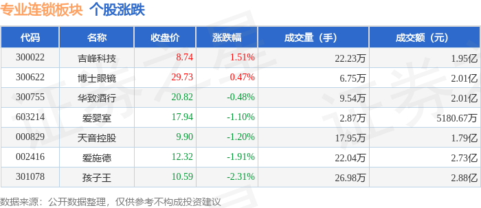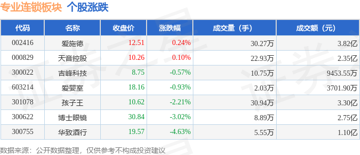 板块整体表现 - 10月30日专业连锁板块整体下跌1.2%,领跌个股为孩子王,跌幅为2.31% [1] - 当日上证指数报收于3986.9点,下跌0.73%,深证成指报收于13532.13点,下跌1.16% [1] - 板块内7只个股中,2只上涨,5只下跌,吉峰科技涨幅最大为1.51% [1] 个股市场表现 - 孩子王收盘价6.50元,成交量26.98万手,成交额2.88亿元,跌幅2.31%为板块最大跌幅 [1] - 爰施德跌幅1.91%,成交额2.73亿元,天音控股跌幅1.20%,成交额1.79亿元 [1] - 华致酒行跌幅0.48%,成交额2.01亿元,博士眼镜涨幅0.47%,成交额2.01亿元 [1] - 爱婴室跌幅1.10%,成交额5180.67万元,吉峰科技涨幅1.51%,成交额1.95亿元 [1] 板块资金流向 - 专业连锁板块主力资金净流出4737.28万元,游资资金净流出305.48万元,散户资金净流入5042.76万元 [1] - 孩子王主力资金净流出5341.99万元,净占比-18.53%,为板块最高主力净流出 [2] - 华致酒行主力资金净流出2445.91万元,净占比-12.19%,吉峰科技主力资金净流出2330.45万元,净占比-11.96% [2] - 博士眼镜主力资金净流入999.36万元,净占比4.96%,爱婴室主力资金净流入493.03万元,净占比9.52% [2]