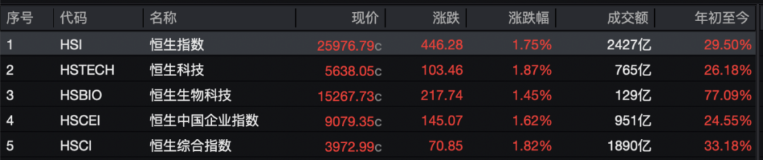 12月12日,港股三大指数集体大涨。其中,恒生指数收涨1.75%,报25976.79点,恒生科技指数涨1.87%,恒生中国企业指数涨1.62%。全日大市成交额为 2427亿港元,南向资金净卖出52.87亿港元。 【导读】重磅合作,阿里健康大涨!国际机构唱多,网易大涨 | 序号 | 代码 | 名称 | 现价 | 涨跌 | 涨跌幅 | 成交额 | 年初至今 | | --- | --- | --- | --- | --- | --- | --- | --- | | 1 | HSI | 恒生指数 | 25976.79c | 446.28 | 1.75% | 2427亿 | 29.50% | | 2 | HSTECH | 恒生科技 | 5638.05c | 103.46 | 1.87% | 765亿 | 26.18% | | 3 | HSBIO | 恒生生物科技 | 15267.73c | 217.74 | 1.45% | 129亿 | 77.09% | | ব | HSCEI | 恒生中国企业指数 | 9079.35c | 145.07 | 1.62% | 951亿 | 24.55% | | 5 | HSCI | 恒 ...