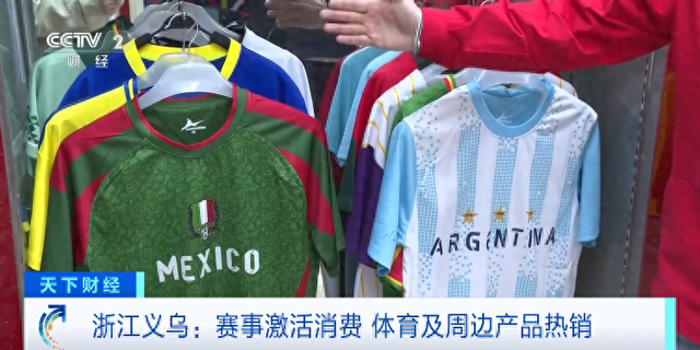 跟往年不太一样,今年球迷服设计的款型更加丰富,穿着群体也更多了。现在每款球迷服都新增了儿童 版,甚至还有宠物穿的小尺寸版本。这些新款式的推出,特别受海外客户欢迎,不少客户一看样品,当 场就下单了。 最近国内赛事活动接连不断,同时,2026年美加墨世界杯也将在6月份开幕,赛事经济持续升温。在全 球小商品集散地浙江义乌,借国内外赛事商机,不少体育及其周边产品热销。 记者来到义乌国际商贸城三区的体育用品专区,不少商户表示,虽然现在距离世界杯开幕还有不到五个 月的时间,但从去年五六月份开始,订单就已经接踵而至了。 在一家主营足球队球迷服的店铺里,目前卖得最好的是东道主之一的墨西哥队球迷服,订单约有30万 件。除东道主外,传统强队的球迷服也卖得很好,比如阿根廷队、巴西队、西班牙队等,其中,阿根廷 队的球迷服出货量在20万件左右。 回顾以往世界杯,每一次都给义乌的市场带来了可观的流量和出口增长。根据义乌市体育用品协会估 算,上届卡塔尔世界杯32强锁定后,"义乌制造"几乎占到世界杯周边市场的70%。 来源:央视财经微信公众号 ...