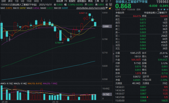 周五(10月31日),以光模块为核心的算力硬件继续回调,三巨头继续大跌,光模块含量超51%的创业 板人工智能一度跌超3%。其中,天孚通信、中际旭创领跌超8%,新易盛、联特科技、光库科技、长芯 博创等多股跌超5%。上涨方面,AI应用表现活跃,深信服领涨超13%,蓝色光标、中文在线、易点天 下等多股跌超5%。 热门ETF方面,同类规模最大、流动性突出的创业板人工智能ETF(159363)场内继续下挫超3%,日线 三连阴,全天成交额超9亿元。资金再度净申购8200万份,此前三日已累计净买入超2亿元。 "光模块ETF"哪里找?建议重点关注全市场首只创业板人工智能ETF(159363)及场外联接(A类 023407、C类023408),标的指数重点布局光模块龙头"易中天",光模块含量超51%。从赛道分布看, 逾七成仓位布局算力,超两成仓位布局AI应用,能够高效捕捉AI主题行情。(截至2025.9.30) 同类比较看,截至10月30日,创业板人工智能ETF(159363)最新规模超36亿元,近1个月日均成交额 超7亿元,规模、交投在跟踪创业板人工智能指数的7只ETF中高居第一。 数据来源:沪深交易所等。注:"全市场首只" ...