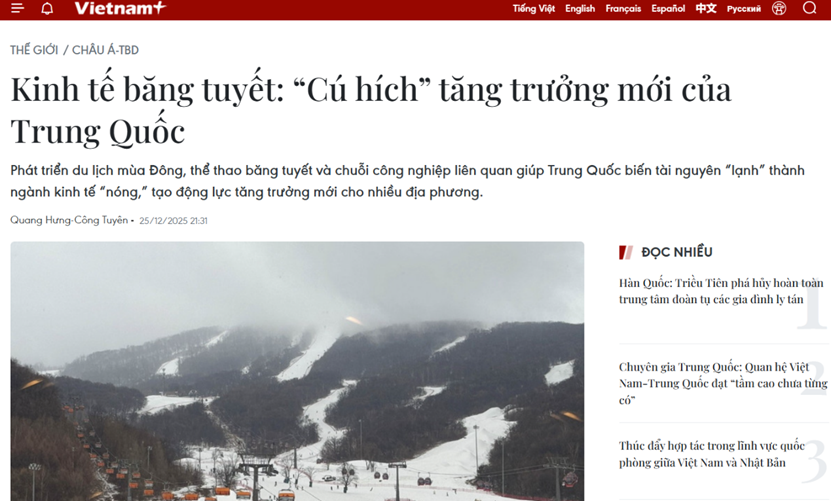 【环球网财经综合报道】日前,中国旅游研究院发布《中国冰雪旅游发展报告(2026)》指出,我国冰雪旅游正进入 持续繁荣的新阶段。预计2025-2026冬季,我国冰雪旅游休闲人数将达到3.6亿人次,冰雪旅游休闲收入有望达到4500 亿元。 越南通讯社近日发文称,中国冰雪经济正崛起为新的增长动力,预计2025年总体价值将超过10000亿元人民币。 报道还提到,2024-2025年冰雪季,消费额和游客人次大幅增长,不仅带动旅游收入,还在促进区域联动和就业;中国 政府将冰雪经济视为国家战略,目标到2030年规模超1.5万亿元。 特别是在北京冬奥会推波助澜下,形成产业链全面发展,如滑雪设备制造、冬季服装等相关行业扩增。以吉林省为 例,冰雪项目的经济效益与社会融合日益显著,有望为全球经济增长注入新的动力。 该报道强调,中国冰雪经济的亮点在于旅游业与相对完整的产业链模式并行发展,从滑雪设备制造、冬季运动服装到 人造冰雪技术、活动组织、教练培训和文化创意内容开发,相关行业正在同步发展,创造巨大的附加值。中国的冰雪 经济不仅是利用气候优势的故事,更是经济发展的创新思维的生动证明,将挑战转化为机遇,为全球经济增长多变的 背景下创造 ...