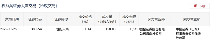 世纪天鸿今日大宗交易折价成交150万股,成交额1671万元