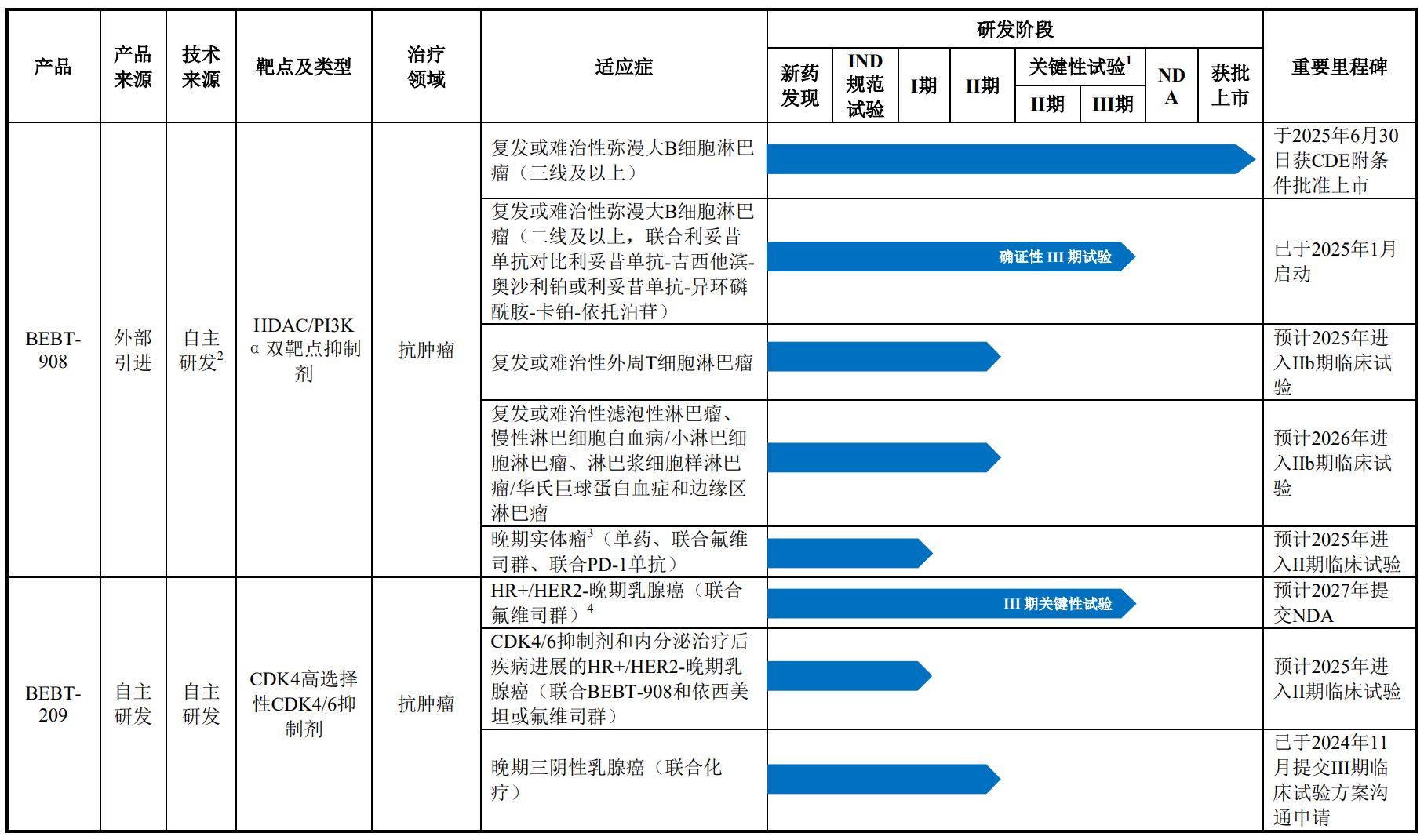公司基本情况与上市信息 - 公司于10月17日开启申购,发行价格为17.78元/股,申购上限为1.4万股,于上交所上市,保荐机构为中信证券 [1] - 公司是一家以临床价值为导向、专注于创新药自主研发的生物医药企业,聚焦于肿瘤、自身免疫性疾病、代谢性疾病等重大疾病领域 [1] 核心产品管线与研发进展 - 公司已有1款"突破性治疗药物品种"BEBT-908获批上市,用于三线及以上治疗复发或难治性弥漫大B细胞淋巴瘤 [1] - BEBT-908是一种针对HDAC/PI3Kα设计的全球首个获批上市的小分子双靶点抑制剂,截至2025年6月30日,除该产品外,国内外尚无其他HDAC/PI3Kα抑制剂获批上市 [1] - BEBT-908的适应症覆盖多种血液肿瘤和实体瘤,包括复发或难治性外周T细胞淋巴瘤、滤泡性淋巴瘤以及晚期实体瘤等 [2] - 核心产品BEBT-209处于III期临床试验阶段,BEBT-109已获准开展III期临床试验 [1] - BEBT-209为高选择性CDK4/6抑制剂,适应症为HR+/HER2-晚期乳腺癌等 [2] - BEBT-109为泛突变型EGFR抑制剂,适应症为EGFR 20外显子插入突变的非小细胞肺癌 [3] - 公司另有5个产品处于I期临床试验阶段,包括BEBT-260、BEBT-305、BEBT-503等,以及多个创新药产品处于临床前研究阶段 [1][3] 财务状况 - 公司2022年度、2023年度、2024年度净利润分别约为-1.88亿元、-1.73亿元、-5599.83万元人民币 [3] - 公司2022年度、2023年度、2024年度归属于普通股股东的净利润分别为-18,833.88万元、-17,275.51万元、-5,599.83万元 [4] - 公司2024年12月31日资产总额为33,247.71万元,归属于母公司所有者权益为29,022.01万元,资产负债率为12.38% [4] - 公司报告期内经营活动产生的现金流量净额持续为负,2022年至2024年分别为-12,766.89万元、-12,737.30万元、-8,961.35万元 [4] - 公司目前尚未盈利且无营业收入,主要产品均处于研发阶段,预期未来仍需大规模持续研发投入,短期内可能无法实现盈利或进行利润分配 [3][4]