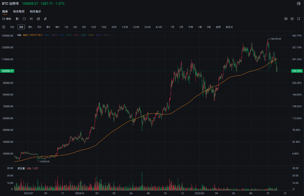 11月4日,比特币曾一度跌破10万美元,最低跌至98888.8美元/枚。 另外,以太坊跌破3300美元,现报3239.6美元/枚,24小时跌幅达4.73%。 SOL跌破160美元,现报153美元/枚,24小时跌幅为3.57%。此外,XRP、HYPE、BNB等纷纷下跌。 | 币种/持仓量 | | 价格 | 24h变化 | | --- | --- | --- | --- | | BTC | $688.4亿 -0.1% | 100278 | -2.61% | | ETH | $380亿 -3.9% | 3259 | -3.99% | | SOL | | | | | 1 | $73亿 -4.0% | 153 | -3.57% | | XRP | | 2.182 | -4.85% | | $32.3亿 -7.7% | | | | | НУРЕ | | 38.96 | -2.64% | | $16亿 -3.8% | | | | | BNB | | 944.6 | -0.93% | | $14.4亿 +1.4% | | | | Coinglass数据显示,过去24小时加密货币市场共有超23万人被爆仓,爆仓总金额为6.75亿 ...