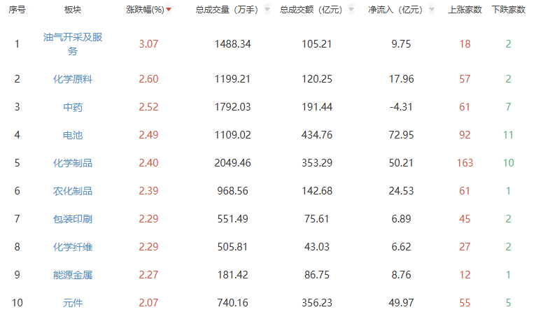 A股市场整体表现 - A股三大指数早盘探底回升全线翻红 截至午间收盘 上证指数报4080.31点 涨幅0.11% 深证成指报14043.17点 涨幅0.65% 创业板指报3281.45点 涨幅0.65% [1] 领涨板块分析 - **油气开采及服务**板块涨幅居首 达3.07% 总成交额105.21亿元 净流入资金9.75亿元 板块内上涨家数18家 [1][2] - **化学原料**板块涨幅2.60% 总成交额120.25亿元 净流入资金17.96亿元 板块内上涨家数57家 下跌2家 [1][2] - **中药**板块涨幅2.52% 总成交额191.44亿元 但呈现资金净流出4.31亿元 板块内上涨家数61家 下跌7家 [1][2] - **电池**板块涨幅2.49% 总成交额434.76亿元 为所有板块中成交额最高 净流入资金72.95亿元 同样为所有板块中最高 板块内上涨家数92家 下跌11家 [2] - **化学制品**板块涨幅2.40% 总成交额353.29亿元 净流入资金50.21亿元 板块内上涨家数163家 下跌10家 [2] - **农化制品**板块涨幅2.39% 总成交额142.68亿元 净流入资金24.53亿元 板块内上涨家数61家 下跌1家 [2] - **包装印刷**与**化学纤维**板块涨幅均为2.29% 成交额分别为75.61亿元和43.03亿元 净流入资金分别为6.89亿元和6.62亿元 [2] - **能源金属**板块涨幅2.27% 总成交额86.75亿元 净流入资金8.76亿元 [2] - **元件**板块涨幅2.07% 总成交额356.23亿元 净流入资金49.97亿元 [2] 领跌板块分析 - **白酒**板块跌幅最大 为-2.57% 总成交额171.53亿元 净流出资金18.03亿元 板块内20家公司全部下跌 [1][2] - **旅游及酒店**板块跌幅-1.57% 总成交额58.06亿元 净流出资金6.06亿元 [1][2] - **机场航运**板块跌幅-1.04% 总成交额31.63亿元 净流出资金2.78亿元 [1][2] - **零售**板块跌幅-1.01% 总成交额169.06亿元 净流出资金24.71亿元 为所有板块中净流出额最高 板块内上涨17家 下跌40家 [2] - **文化传媒**板块跌幅-0.86% 总成交额369.06亿元 但呈现资金净流入1.66亿元 [2] - **煤炭开采加工**板块跌幅-0.54% 总成交额91.51亿元 净流出资金2.67亿元 [2] - **保险**板块跌幅-0.54% 总成交额49.95亿元 净流出资金1.54亿元 板块内5家公司全部下跌 [2]