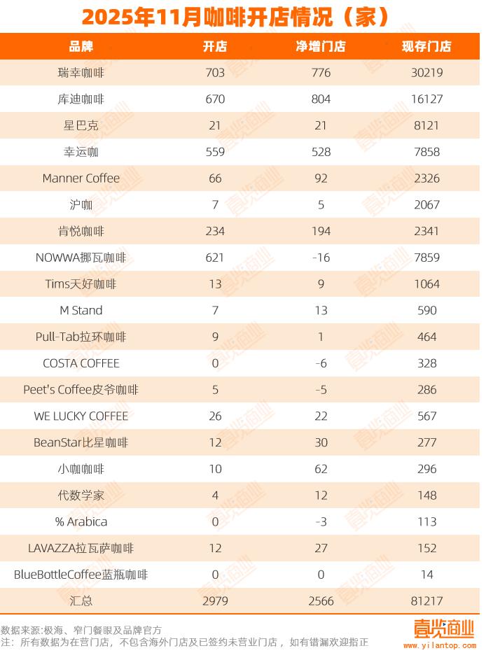 11月,壹览商业长期跟踪的20家连锁咖啡品牌共新开2979家门店,同比增长75.64%;总门店突破8.1万家,共计81217家,环比净增2566家,整体规模持续扩 大。 从新开门店看,幸运咖(新开门店不包含海外门店及已签约未营业门店)、瑞幸咖啡(新开门店不包含海外门店及已签约未营业门店)、库迪咖啡(新开门 店不包含海外门店及已签约未营业门店)、挪瓦咖啡(新开门店不包含海外门店及已签约未营业门店)四家品牌共开店2553家,合计贡献了85.69%的新增 门店。 | 2025年11月咖啡开店情况(家) | | --- | | 品牌 | 开店 | 净增门店 | 现存门店 | | --- | --- | --- | --- | | 瑞幸咖啡 | 703 | 776 | 30219 | | 库迪咖啡 | 670 | 804 | 16127 | | 星巴克 | 21 | 21 | 8121 | | 幸运咖 | રેત્વે | 528 | 7858 | | Manner Coffee | 66 | 92 | 2326 | | 沪咖 | 7 | 5 | 2067 | | 肯悦咖啡 | 234 | 194 | 2341 | | ...