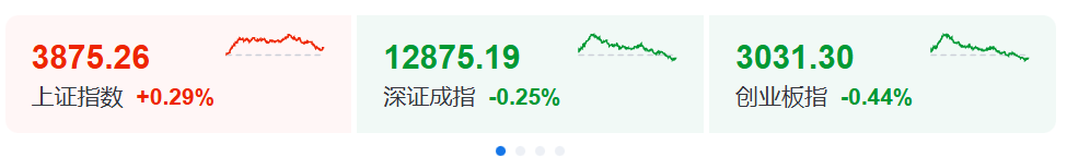 | 上证指数 | 深证成指 | 北证5( | | --- | --- | --- | | 3875.26 | 12875.19 | 1382.3 | | +11.07 +0.29% -32.64 -0.25% -8.68 -0 | | | | 科创50 | 创业板指 | 万得全/ | | 1310.70 | 3031.30 | 6158.3 | | -4.34 -0.33% -13.40 -0.44% -0.45 -0 | | | | 沪深300 | 中证500 | 中证A5( | | 4515.40 | 6951.28 | 5415.9 | | -2.22 -0.05% -13.76 -0.20% -6.59 -0 | | | | 中证1000 | 中证2000 | 中证红和 | | 7257.45 | 3050.92 | 5540.0 | | +9.01 +0.12% +9.51 +0.31% +9.21 +0 | | | A股三大指数今日冲高回落,截至收盘,沪指涨0.29%报3875点,深证成指跌0.25%,创业板指跌0.44%。全市场成交额1.72万亿元,较前一交易日缩量740亿 元,近2800上涨。 ...