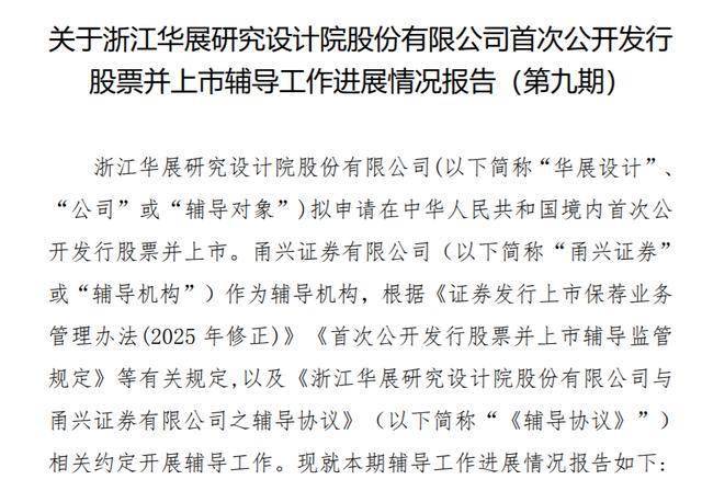 瑞财经 王敏 10月16日,浙江华展研究设计院股份有限公司(以下简称"华展设计")发布关于首次公开 发行股票并上市辅导工作进展报告(第九期),辅导机构为甬兴证券。 据悉,华展设计于2023年7月在宁波证监局启动IPO辅导备案。本期辅导工作于2025年7月1日开始,至 2025年9月30日结束。 据辅导报告,2025年3月14日,华展设计的控股股东宁波市轨道交通集团有限公司发布《关于法定代表 人、董事长接受纪律审查和监察调查及无法履职的公告》,杨蔚涉嫌严重违纪违法,主动投案,接受宁 波市纪委监委纪律审查和监察调查。 2025年8月27日,宁波市人民政府国有资产监督管理委员会出具《股东决定》,杨蔚不再担任宁波市轨 道交通集团有限公司董事长、董事职务。董事长相关事项暂由公司法定代表人、副董事长、总经理姚晔 代为审批。 华展设计成立于1989年,是由宁波市轨道交通集团公司(市属大型国企)、中国铁路设计集团(央企) 两家参、控股的混合所有制设计院,也是宁波市首个被认定为国家高新技术企业的设计院。 华展设计拥有建筑工程甲级、轨道交通工程甲级、工程勘察专业类岩土工程甲级、工程测量甲级;风景 园林工程、道路工程、桥梁工程、排 ...