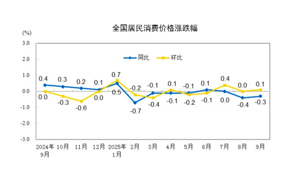 国家统计局:9月CPI环比上涨0.1% PPI同比降幅继续收窄