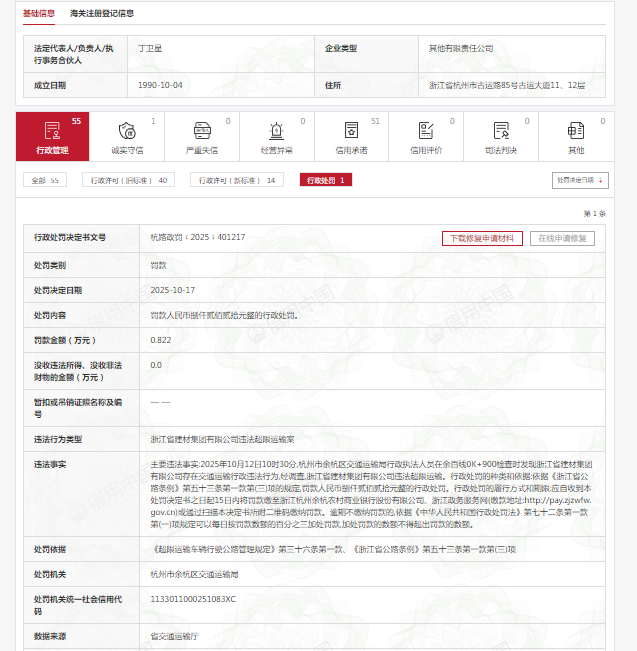 行政处罚事件 - 浙江省建材集团有限公司于2025年10月17日因违法超限运输受到行政处罚 [1] - 处罚机关为杭州市余杭区交通运输局,处罚决定书文号为杭路政罚﹝2025﹞401217 [1] - 公司被处以罚款人民币8220元(即0.822万元) [2] - 违法事实为2025年10月12日10时30分在余百线0K+900处被查获违法超限运输 [2] - 处罚依据为《浙江省公路条例》第五十三条第一款第(三)项 [2][3] - 罚款需在收到处罚决定书之日起15日内缴纳,逾期将每日加处罚款数额百分之三的罚款,加处罚款数额不超过原罚款数额 [2] 公司基本信息 - 浙江省建材集团有限公司成立于1990年10月4日,注册资本为35000万元人民币 [2][5] - 公司法定代表人为丁卫星,注册地址为浙江省杭州市古运路85号古运大厦11、12层 [2][5] - 企业类型为其他有限责任公司 [2] - 公司是浙江省建设投资集团股份有限公司建筑工业制造板块的核心成员企业之一 [5] - 公司大股东浙江省建工集团有限责任公司持股77.04%,上市公司浙江建投(002761.SZ)持股22.96% [5] 业务与运营 - 公司是一家集原材料自制、研发、设计、生产、安装、咨询于一体的全产业链规上企业 [5] - 业务范围覆盖全国20多个省(市、区)以及阿尔及利亚、斯里兰卡、马来西亚、沙特等多个国家与地区 [5] - 预拌混凝土是公司的核心业务之一,在杭州市、嘉兴市、台州市和南昌市建有五个生产供应基地 [4] - 公司混凝土年产能达500万立方米,可生产C15-C80强度等级的预拌混凝土、高性能混凝土和特种混凝土 [4] - 公司拥有垂直泵送超200米高的纪录,德清基地设有符合国家环保要求的专业外加剂生产线并拥有多项专利 [4] - 公司业务板块包括预制构件板块、工程板块和混凝土板块 [4]