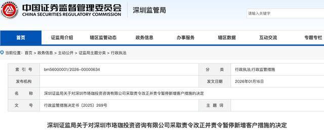 监管处罚与违规行为 - 深圳证监局对深圳珞珈投资咨询有限公司采取责令改正并暂停新增客户6个月的监管措施 同时对公司董事长陈杰采取监管谈话的监管措施 [1] - 公司存在的违规问题包括:营销宣传中存在虚假、误导性内容 部分投资顾问在公开直播时推荐股票、预测个股走势 个别未注册人员向客户提供投资建议 投资者适当性管理不到位 内部控制与合规管理有效性不足 部分业务和合规工作实际由第三方机构开展 [2] - 上述情形违反了《证券投资顾问业务暂行规定》和《证券期货投资者适当性管理办法》的相关条款 监管决定综合考虑了公司存在向监管部门提供不完整信息等情况 [2] 历史违规与公司背景 - 这是这家存续29年的老牌投资咨询机构在短短一年内第二次被暂停新增客户 上一次是在2025年1月10日因多项违规被责令整改并暂停新增客户3个月 [3] - 在2024年末 公司董事长陈杰已因当时的违规事项被深圳市监局采取监管谈话的监管措施 另有一名员工廖桂铭也因营销直播未经合规审核、存在误导性信息及提供不实资讯被采取监管谈话措施 [3] - 公司是1998年首批获得中国证监会颁发的证券投资咨询业务资格的机构 拥有国内仅78家公司持有的《证券投资咨询业务许可证》以及广电总局颁发的《网络传播视听节目许可证》 [3]