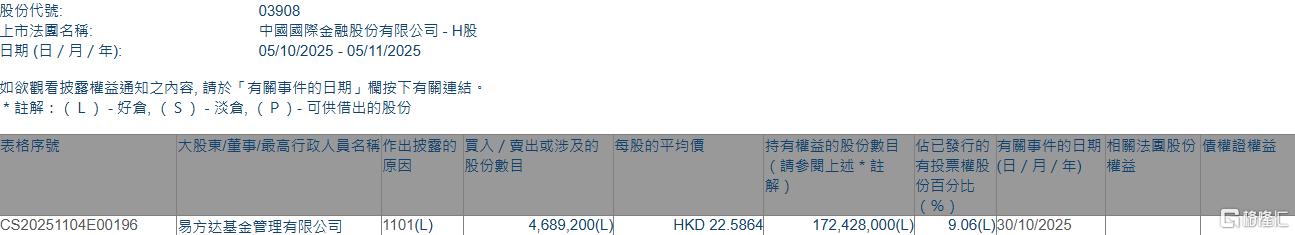 格隆汇11月5日丨根据联交所最新权益披露资料显示,2025年10月30日,中金公司(03908.HK)获易方达基金管理有限公司在场内以每股均价22.5864港元增持 468.92万股,涉资约1.06亿港元。 | 表格序號 | 大股東/董事/最高行政人員名稱作出披露的 買入 / 費出或涉及的 每股的平均價 | | | | 持有權益的股份數目 佔已發行的 有關事件的日期 | | | --- | --- | --- | --- | --- | --- | --- | | | 股份數目 | 原因 | | | (詩参関上述 * 註 | | | | | | | | 份百分比 解 | | | | | | | | (%) | | | CS20251104E00196 | 易方达基金管理有限公司 | 1101(L) | 4.689,200(L | HKD 22.5864 | 172,428,000(L | 9.06(L)30/10/2025 | 增持后,易方达基金管理有限公司最新持股数目为172,428,000股,持股比例由8.81%上升至9.06%。 | 股份代號: | 03908 | | --- | --- | | 上市法 ...