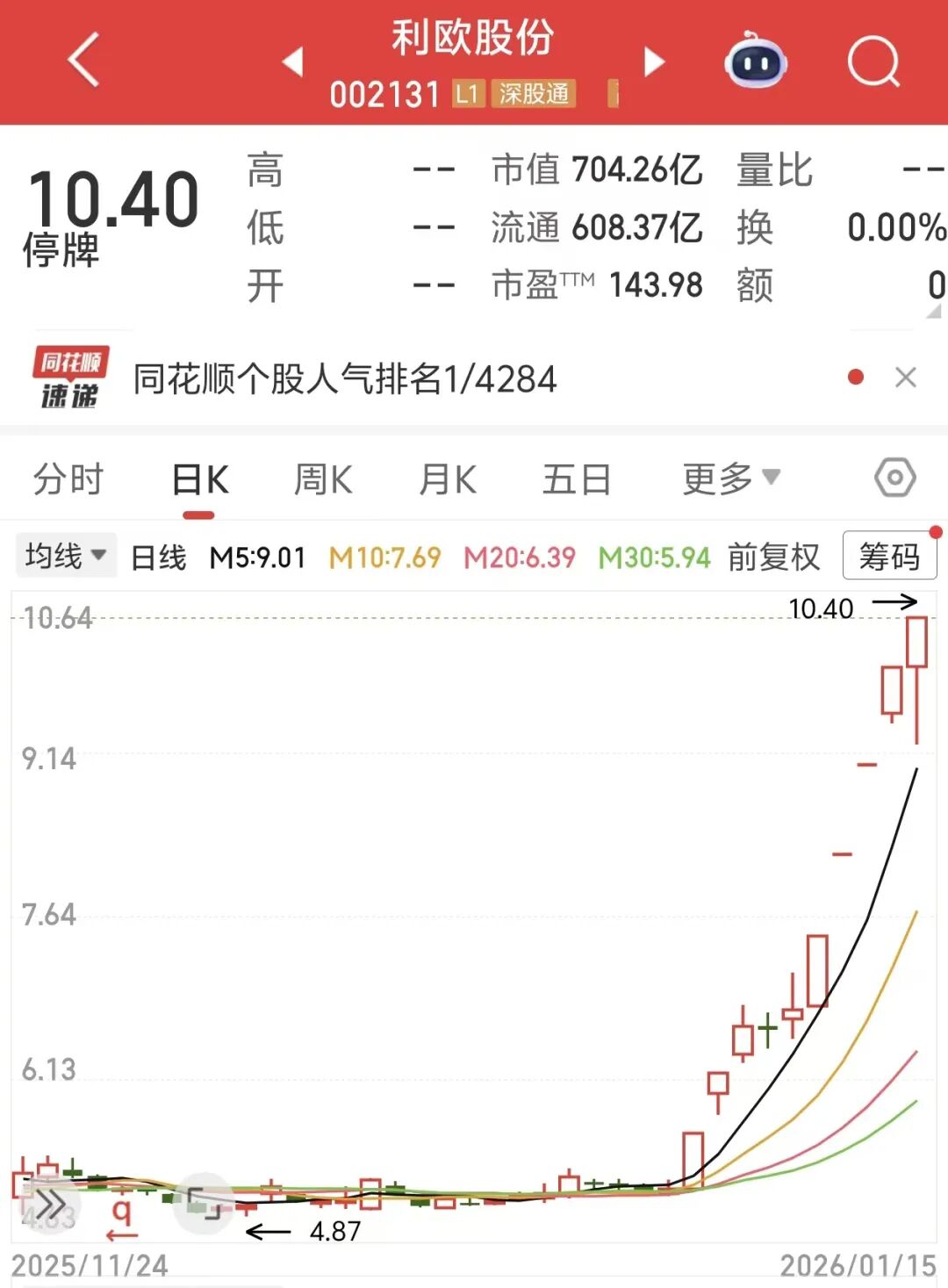 1月20日晚间,利欧股份(002131)(002131)公告称,公司就股价波动的相关事项进行了核查。鉴于相关自查工作已完成,公司股票将于1月21日起复 牌。 作为"AI应用""GEO营销"等热门概念标的股,利欧股份股价近期一路攀高,自2025年12月31日至2026年1月15日这10个交易日期间,区间累计涨幅达 102.73%。 | AI交易策略 F9 前复权 超级叠加 | > | 利欧股份 | | 002131 | 画线 工具 <> ② | | --- | --- | --- | --- | --- | --- | | 00%(0.00) 开 10.40 高 10.40 低 10.40 均 10.40 换 0.00% 振 0.00% | WP | 0.00 | | 0.00(USD) | | | ↑ MA120 5.44 ↑ MA250 4.55 ↑ 2025/11/12-2026/01/20(48日) ▼ ▼ ロ | | | | (0.00) 0.00% | | | | | SZSE CNY 08:27:15 | 疑似减持受限 | 通融公 ● + | | | 10.40 | | 委比 | 0.00% 委差 ...