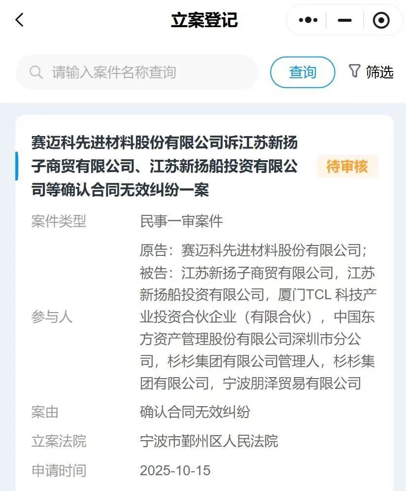 重整计划的法律纠纷 - 浙江赛迈科先进材料股份有限公司起诉要求确认杉杉集团《重整投资协议》无效,并延迟债权人会议 [1] - 诉讼案由为确认合同无效纠纷,立案法院为宁波市鄞州区人民法院,申请时间为2025年10月15日 [3] - 赛迈科声称其与江苏新扬子商贸组成的联合体参与了前两次重整投资人遴选,但最终被新扬子商贸排除在协议之外 [1] 投资人遴选过程与争议 - 赛迈科联合江苏新扬子商贸、东方资产管理深圳分公司组成联合体,凭借“产业协同”优势从17家意向方中成功入围 [3] - 赛迈科主营特种石墨材料,与杉杉股份负极材料业务高度契合,是其联合体入围的核心优势 [3][5] - 入围后赛迈科陷入信息真空,未被告知后续遴选进展及协议签署细节,直至杉杉股份公告发布才知被替换 [4][5] - 赛迈科认为新扬子商贸擅自调整方案,用主营偏光片的顶替者取代了赛迈科,后者与杉杉核心业务协同性微弱 [5] 赛迈科的损失与诉求 - 作为初始入围成员,赛迈科本可按11.44元/股的价格认购杉杉股份股权 [5] - 被踢出局导致其股权收益损失初步测算超千万元,前期投入的方案设计和尽调成本也付诸东流 [5] 杉杉股份的业务与财务表现 - 杉杉股份是新能源材料和高端显示材料供应商,核心业务为锂电池负极材料和偏光片 [6] - 其人造石墨负极材料全球产量连续多年第一,规划2026年硅基产能达8万吨,目标全球市占率20% [6] - 旗下杉金光电是全球产能最大、市场份额领先的偏光片供应商 [6] - 今年上半年公司营收98.58亿元,同比增长11.78%,净利润2.07亿元,同比增长1079.59% [6] 重整交易方案的核心条款 - 重整投资人联合体将获得杉杉股份23.36%的股权,交易总对价为32.84亿元 [6] - 任元林控制的江苏新扬子商贸作为第一大有限合伙人最低只需出资约10.22亿元即可控制这家市值约300亿元的上市公司 [6] - 新扬船投资出资的15.33亿元后续可招募其他投资者承接,即先垫付后找接盘方退出 [6] - 重整完成后,杉杉股份实际控制人将变更为任元林 [7]