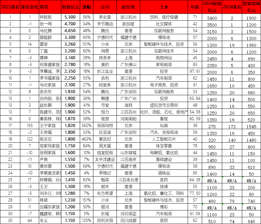 【导读】钟睒睒第四次成为中国首富 ,5300亿元财富刷新纪录 中国基金报记者 邱德坤 10月28日,胡润研究院发布的《2025衡昌烧坊·胡润百富榜》显示,截至2025年9月1日, 农夫山泉钟睒睒第四次成为中国首富, 以5300亿元财富 刷新中国首富的财富纪录。 小米集团雷军的财富 增长1960亿元,成为上榜企业家中的"财富增长王", 并且以3260亿元 财富排名榜单第五位, 主要 受益于 小米汽车增长,以及手机 的 高端化突破。 | 排名 | 排名 | 姓名 | 财富(亿元 | 涨幅 | 公司 | 居住地 | 主业 | | --- | --- | --- | --- | --- | --- | --- | --- | | | 变化 | | 人民币) | | | | | | 1 | 1 | 钟滕滕 | 5,300 | 56% | 养生堂 | 浙江杭州 | 饮料、医疗保健 | | 2 | -1 | 张一鸣 | 4,700 | 34% | 字节跳动 | 新加坡 | 社交媒体 | | 3 | 0 | 马化腾 | 4,650 | 48% | 腾讯 | 香港 | 互联网服务 | | 4 | 2 | 曾毓群 | 3.300 ...
