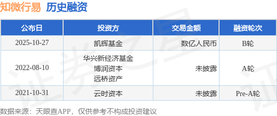 知微行易致力于服务中国的企业客户,通过先进的智能技术赋能这些企业的智能和数字化,开启运营转 型,帮助企业实现业绩提升和业务创新。 证券之星消息,根据天眼查APP于10月27日公布的信息整理,知微行易(上海)智能科技有限公司B轮 融资,融资额数亿人民币,参与投资的机构包括凯辉基金。 | 公布日 | 投资方 | 交易金额 | 融资轮次 | | --- | --- | --- | --- | | 2025-10-27 | 凯辉基金 | 数亿人民币 | B轮 | | 2022-08-10 | ##88##fff 博润资本 | 未披露 | A轮 | | | 远桥资产 | | | | 2021-10-31 | 云时资本 | 未披露 | Pre-A轮 | 以上内容为证券之星据公开信息整理,由AI算法生成(网信算备310104345710301240019号),不构成 投资建议。 数据来源:天眼查APP ...
