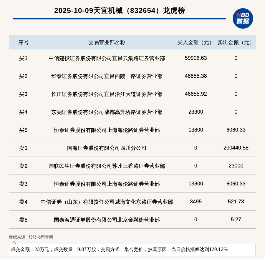 每经讯,2025年10月9日,新三板创新层公司天宜机械(832654,收盘价:2.33元)登上龙虎榜,交易方式是集合竞价,披露原 因是当日价格振幅达到129.13%,成交数量9.87万股,成交金额23万元。买一席位为中信建投证券股份有限公司宜昌云集路证券 营业部,买入5.99万元;卖一席位为国海证券股份有限公司四川分公司,卖出20.04万元。 | | 2025-10-09天宜机械(832654) 龙虎榜 | | | | --- | --- | --- | --- | | 序号 | 交易营业部名称 | 买入金额(元) | 卖出金额(元) | | न्द्र ग | 中信建投证券股份有限公司宜昌云集路证券营业部 | 59906.63 | 0 | | 买2 | 华泰证券股份有限公司宜昌西陵一路证券营业部 | 48855.38 | 0 | | ポ3 | 长江证券股份有限公司宜昌沿江大道证券营业部 | 46655.92 | 0 | | नेटर | 东莞证券股份有限公司成都高升桥路证券营业部 | 23300 | 0 | | ન્નેર | 恒泰证券股份有限公司上海海伦路证券营业部 | 13800 | 6060.33 | ...