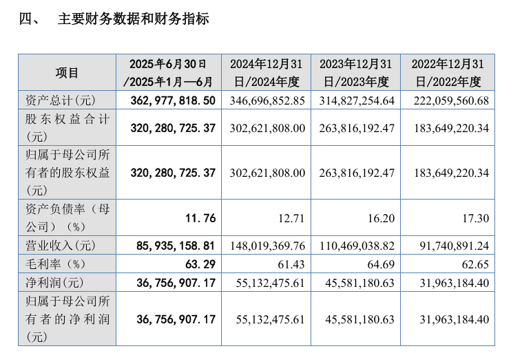 公司基本情况 - 公司名称为北矿检测,股票代码920160BJ,于11月3日开启申购,发行价格为6.7元/股,申购上限为127.44万股,发行市盈率为14.99倍,上市地点为北交所,保荐机构为中信证券 [1] - 公司是国内领先的有色金属检验检测服务机构,业务涵盖矿石及矿产品、冶炼产品、环境样品、再生资源、先进材料、选冶药剂检验检测,以及技术研发、标准化、技术推广和高端分析仪器研发 [1] - 公司是国家级专精特新"小巨人"企业、国家高新技术企业、LME指定的LSA,同时也是国家重有色金属质量检验检测中心 [1] 股权结构与控股股东 - 控股股东矿冶集团直接持有公司86.11%股份,通过矿冶总院间接持有1.53%股份,合计持有公司87.64%股份 [2] - 国务院国有资产监督管理委员会持有矿冶集团100%股份,为公司的实际控制人 [2] 行业地位与技术实力 - 公司负责或参与制定了7项国际标准、83项国家标准、238项行业标准及14项团体标准 [1] - 截至报告期末,公司在境内拥有16项已授权发明专利、17项已授权实用新型专利、4项已授权外观设计专利 [1] 财务表现 - 2022年至2024年,营业收入持续增长,分别为9174.09万元、1.1亿元、1.48亿元人民币,2025年1-6月实现营业收入8593.52万元人民币 [2] - 2022年至2024年,净利润持续增长,分别为3196.32万元、4558.12万元、5513.25万元人民币,2025年1-6月实现净利润3675.69万元人民币 [2] - 公司毛利率水平较高且稳定,2022年至2025年上半年分别为62.65%、64.69%、61.43%、63.29% [3] - 公司资产规模持续扩大,总资产从2022年末的2.22亿元增长至2025年6月30日的3.63亿元 [3] - 公司资产负债率呈下降趋势,从2022年的17.30%降至2025年6月30日的11.76% [3] 业务模式与市场 - 公司检验检测业务范围主要为矿石、矿产品、冶炼产品等,检验检测需求与矿冶行业的交易规模高度相关 [2]