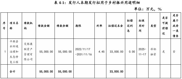 【大河财立方消息】10月24日,河南水利投资集团有限公司披露2025年度第二期中期票据(乡村振兴)发行相 关文件。 本期债券发行规模11亿元,期限3年,其中3.3亿元用于乡村振兴领域,具体为偿还发行人本部平舆县水环境 治理和生态修复工程产生的借款本金;7.7亿元用于偿还发行人本部金融机构借款、应付债务融资工具等本 息。 | 序 를 | 借款机构/ 债券简称 | 借款全额 | 借款余额 | 期限 | 利率 | 拟偿还本金 | 拟偿还利 .5 | 拟使 用时 间 | 美型 | 是否 可提 前偿 | 是否 属于 政府 一英 | 用途 | | --- | --- | --- | --- | --- | --- | --- | --- | --- | --- | --- | --- | --- | | | | | | | | | | | | रूर | 债务 | | | 1 | 兴业银行股 | 3. 917. 10 | 3, 917. 10 | 2024/5/6 | 3.90 | 195. 86 | 0.00 | 2025- | 银行 | 联 | 중 | 补流 | | | 份有限公司 | | | -2031/5/6 | ...