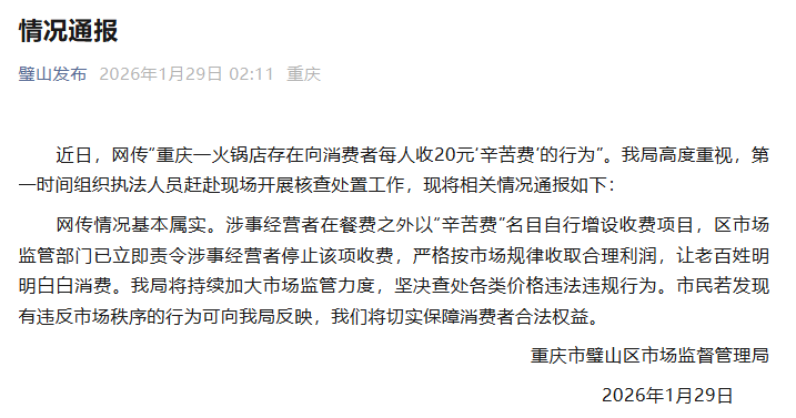 本文转自【璧山发布】; 2026年1月29日 近日,网传"重庆一火锅店存在向消费者每人收20元'辛苦费'的行为"。我局高度重视,第一时间组织执法 人员赶赴现场开展核查处置工作,现将相关情况通报如下: 网传情况基本属实。涉事经营者在餐费之外以"辛苦费"名目自行增设收费项目,区市场监管部门已立即责 令涉事经营者停止该项收费,严格按市场规律收取合理利润,让老百姓明明白白消费。我局将持续加大市 场监管力度,坚决查处各类价格违法违规行为。市民若发现有违反市场秩序的行为可向我局反映,我们将 切实保障消费者合法权益。 重庆市璧山区市场监督管理局 ...