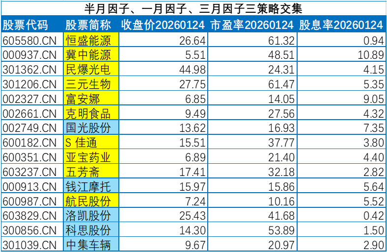 来源:逸柳投研笔记 声明:本文仅作算法测试、研究讨论用,不构成任何投资建议。股市有风险,决策需独立思考,搭建好自己的 逻辑体系和风控体系,切忌人云亦云。 第九期(20260124-20260207),三个测试策略得到的组合交集如下表所示,总共是15只股票,平均股息率 4.60,平均市盈率为32.54。 | | | 半月因子、一月因子、三月因子三策略交集 | | | | --- | --- | --- | --- | --- | | 股票代码 | | 股票简称 收盘价20260124 市盈率20260124 股息率20260124 | | | | 605580.CN | 恒盛能源 | 26.64 | 61.32 | 0.94 | | 000937.CN | 冀中能渡 | 5.51 | 48.51 | 10.89 | | 301362.CN | 民爆光电 | 44.98 | 24.31 | 4.15 | | 301206.CN | 三元生物 | 27.75 | 61.47 | 5.35 | | 002327.CN | 富安娜 | 6.85 | 14.05 | 9.05 | | 002661.CN | 克明食品 | ...