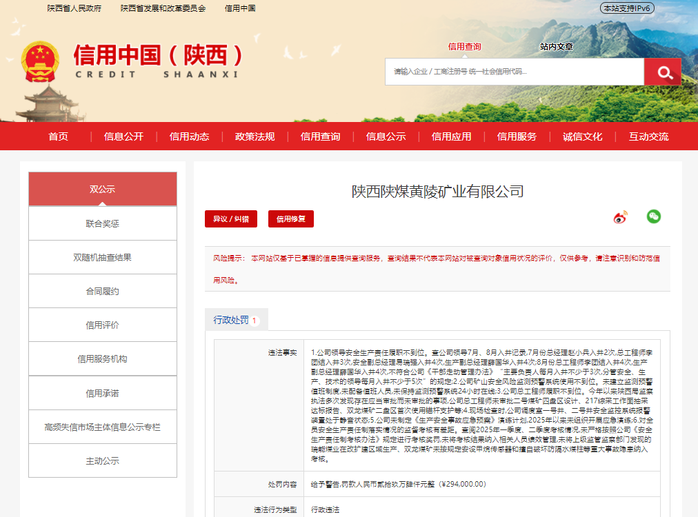 陕西煤业子公司因多项安全生产违法行为被警告并罚款29.4万元