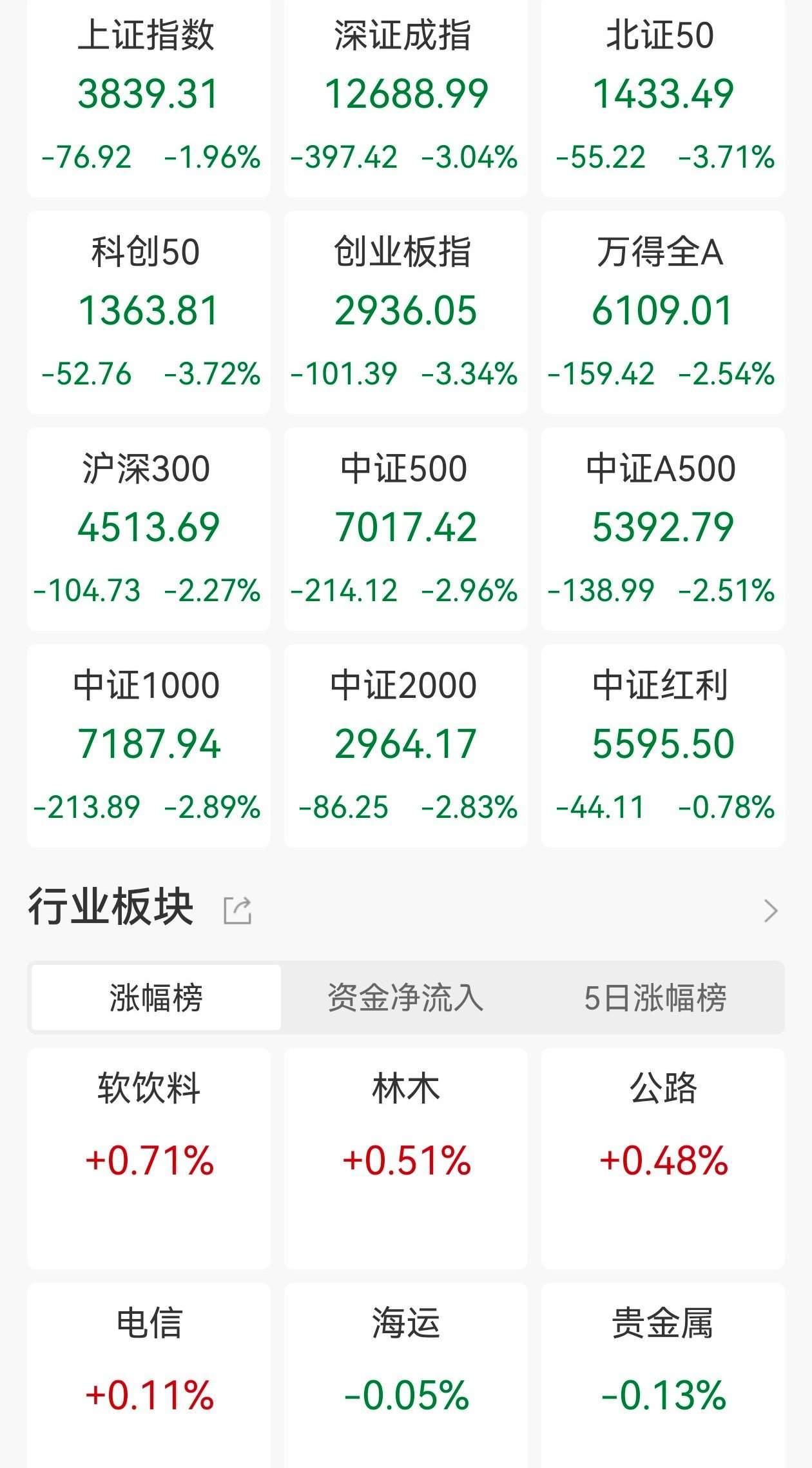 A股收评:三大指数集体下挫,沪指跌近2%失守3900点,深证、创业、科创及北证50跌逾3%,银行,贵金属板块逆势走强!成交额1.95万亿放量57亿,4800股下跌