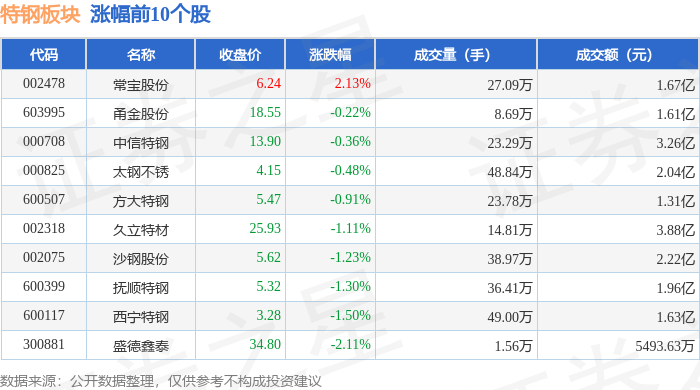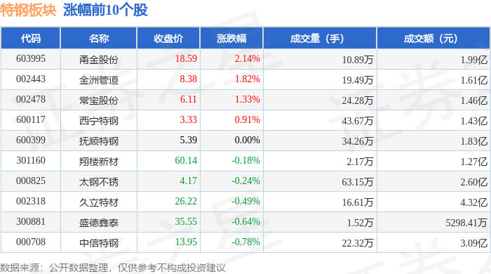 板块整体表现 - 10月10日特钢板块整体上涨1.28%,表现强于大盘,当日上证指数下跌0.94%,深证成指下跌2.7% [1] - 板块内个股普遍上涨,领涨股为方大特钢,涨幅达3.91% [1] - 从资金流向看,特钢板块整体呈现主力资金净流出4541.45万元,游资资金净流出5181.01万元,但散户资金净流入9722.46万元 [2] 领涨个股表现 - 方大特钢收盘价5.58元,涨幅3.91%,成交量35.10万手,成交额1.93亿元,主力资金净流入1804.88万元,净占比9.33% [1][3] - 常宝股份收盘价6.03元,涨幅3.79%,成交量27.44万手,成交额1.63亿元,主力资金净流入590.26万元,净占比3.61% [1][3] - 金洲管道收盘价8.23元,涨幅1.73%,成交量24.25万手,成交额1.98亿元 [1][2] 其他活跃个股 - 西宁特钢收盘价3.30元,涨幅1.54%,成交量52.00万手,成交额1.71亿元,主力资金净流入297.15万元,净占比1.73% [1][3] - 中信特钢收盘价14.06元,涨幅1.52%,成交量26.92万手,成交额3.75亿元 [1][2] - 太钢不锈收盘价4.18元,涨幅1.21%,成交量72.40万手,成交额3.01亿元 [1][2] 资金流向分析 - 板块资金呈现分化,方大特钢、沙钢股份、常宝股份等获得主力资金净流入,其中方大特钢主力净流入占比最高达9.33% [3] - 角金股份主力资金净流出1168.60万元,净占比-7.44%,同时游资净流出2086.16万元,净占比-13.28%,但散户资金净流入3254.76万元,净占比20.71% [3] - 翔楼新材是板块内少数下跌个股,跌幅2.90%,但获得游资资金净流入1418.67万元,净占比9.04% [2][3]