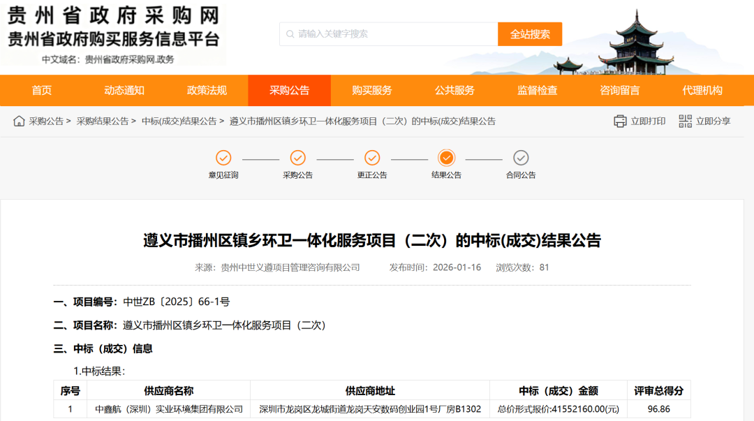 中鑫航重磅落子!3.7亿拿下播州镇乡环卫项目,9年服务深耕西南市场