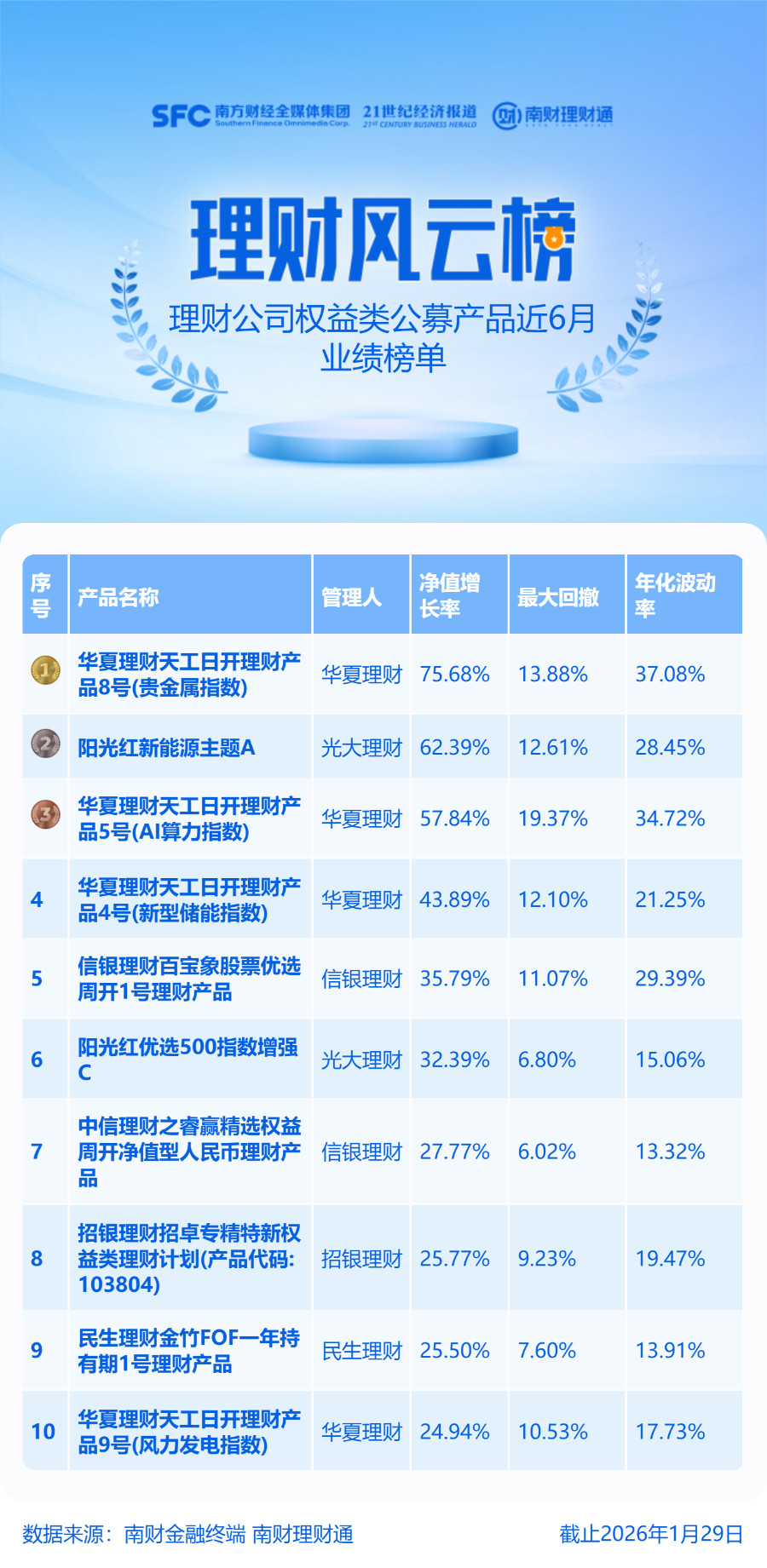 市场整体表现 - 2026年1月A股市场交投活跃,总成交额高达60万亿元,沪深两市成交额连续20个交易日突破2.5万亿元 [5] - 近6个月(2025年10月30日至2026年1月29日)A股三大指数震荡走强,上证指数、深证成指、创业板指分别累计上涨15.19%、26.67%、37.31% [5] - 行业板块表现分化显著,申万一级行业中,有色金属以99.43%的涨幅领涨,通信、电子涨幅居前,而银行、医药生物等板块跌幅居前 [5] 权益类理财产品整体概况 - 近6个月,理财公司权益类公募理财产品净值增长率均值为19.40%,在40只样本产品中有17只净值增长率超过20% [5] - 仅光大理财“阳光红300红利增强”一只产品近6个月净值增长率为负,收益率垫底 [5] - 本期榜单共有5家理财公司上榜,其中华夏理财上榜4只产品,光大理财和信银理财各上榜2只,民生理财和招银理财各上榜1只 [5] 上榜产品业绩与特征 - 本期上榜的10只产品近6个月净值增长率平均值为41.2%,行业/主题类产品领涨 [6] - 华夏理财“天工日开理财产品8号(贵金属指数)”以75.68%的净值增长率位居榜首,光大理财“阳光红新能源主题A”(62.39%)、华夏理财“天工日开理财产品5号(AI算力指数)”(57.84%)和华夏理财“天工日开理财产品4号(新型储能指数)”(43.89%)分列第二至第四名 [3][4][6] - 高收益的行业/主题产品同时呈现高波动特征,净值增长率排名前三的产品年化波动率均超过28% [7] 重点产品分析 - 光大理财“阳光红新能源主题A”投资的权益类资产占产品总资产比例为88.65%,前十大重仓股(穿透后)合计持仓占比近82%,持仓集中,重仓股包含明阳智能、星源材质、鼎胜新材等新能源龙头,其中明阳智能近6个月股价翻倍,鼎胜新材涨超80% [6] - 光大理财“阳光红新能源主题A”在去年四季度遭遇净赎回超632万份,净赎回比例超36%,四季度末资产净值降至1139.95万元,较三季度减少近585万元 [6] - 华夏理财“天工日开理财产品5号(AI算力指数)”去年四季度净值下跌10.95%,前十大成分股包含海光信息、寒武纪、中芯国际等算力及半导体龙头 [7] - 华夏理财“天工日开理财产品5号(AI算力指数)”四季度遭净赎回超410万份,四季度末资产净值降至近2315万元,较三季度减少998万元,其收益表现与跟踪标的指数的差距主要因客户大额申购赎回稀释收益所致 [7]