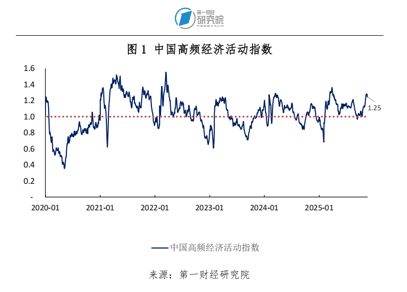 摘要 2025年11月18日第一财经研究院中国高频经济活动指数(YHEI)为1.25,较11月11日下降了0.03。具体来看,截 至11月18日的一周内,工业相关指标"沿海煤炭运价指数"和"进口干散货运价指数"回落,分别下降了0.21和0.03, 是本周YHEI下降的重要原因。本周,服务业相关指标"8城市地铁流量指数"则上升了0.05至1.25。 国家统计局公布10月经济数据。消费方面,10月,社会消费品零售总额为46291.3亿元,同比增长2.9%,增速低 于上月0.1个百分点。其中,商品零售同比增速低于上月0.5个百分点至2.8%,增速连续五个月走低;餐饮收入同 比增速则回升了2.9个百分点至3.8%,为6月以来的最高水平。汽车方面,10月汽车销量同比增长8.82%,增速低 于上月6.04个百分点。 外贸方面,以美元计,10月,进出口金额为5206.32亿美元,同比下降0.3%,今年3月以来首次处于负增长区间。 其中,进口金额同比增速由9月的7.4%降至1.0%;出口金额同比增速由上月的8.3%降至-1.1%。10月,贸易差额同 比也有所下降,降幅为5.9%。 第一财经研究院中国高频经济活动指数(YHEI ...
