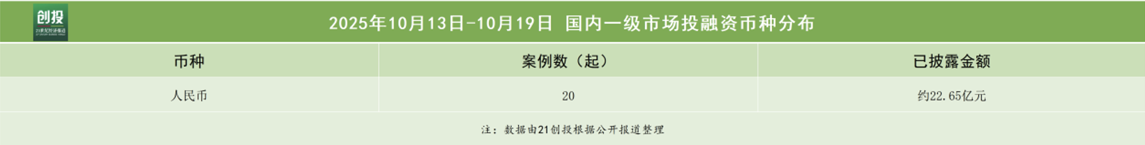 总体融资概况 - 报告期内(2025年10月13日-10月19日)国内一级市场共发生融资事件29起,其中20笔披露了金额,总规模约为22.65亿元人民币 [1] - 从币种分布看,披露案例中全部20起融资均为人民币融资 [2] 行业赛道分布 - 科技与制造行业是融资重点,其中先进制造赛道最为活跃,完成9笔融资,总额约11.6亿元人民币 [1][3] - 人工智能赛道紧随其后,完成6笔融资,披露金额约3.5亿元人民币 [1][3] 地域分布 - 融资活动高度集中于北京市、上海市、广东省和浙江省 [4] - 北京市完成8笔融资,上海市完成6笔,广东省和浙江省各完成4笔融资 [4] 活跃投资机构 - 顺禧基金、广发信德和启明创投在本周较为活跃,各完成2笔投资 [6] - 投资主要集中在科技与制造领域以及医疗健康领域 [6] 医疗健康领域融资案例 - 领创医谷完成近2亿元B轮融资,由顺禧基金、亦庄国投共同领投,专注于神经调控创新技术研发 [9][10] - 华道生物完成超亿元D++轮融资,由博爱新开源领投,专注于细胞免疫治疗药物全产业链技术开发 [15] - 无忧跳动完成近亿元A轮融资,由太平医疗健康基金领投,专注于泛血管疾病诊疗领域 [18][19] - 易刻医疗完成数百万元天使轮融资,由祥峰投资投资,专注于非侵入式神经调控技术 [13][14] - 海创生物完成数千万元A轮融资,由三泽创投投资,专注于肌肤微生态健康护肤方案 [16][17] - 图湃医疗完成E+轮融资,核心技术源自清华科技成果转化 [11][12] 科技与制造领域融资案例 - **先进制造/硬件**:VOLANT沃兰特完成数亿元B轮融资,由华映资本领投,是一家客运电动垂直起降飞行器研发商 [1][27][28];千觉机器人完成亿元级Pre-A轮融资,致力于多模态触觉感知赋能机器人灵巧操作 [45];电擎科技完成数千万元A2轮融资,专注于航空混合电推进系统 [49][50] - **人工智能/AI应用**:未来智能完成亿元级A轮融资,由蚂蚁集团领投,专注于AI办公硬件研发 [25][26];爱诗科技完成1亿元B+轮融资,专注于AI视频生成技术 [52];设序科技获数千万元Pre-B轮融资,提供工业AI生成式设计产品 [20][21][22];穹彻智能完成新一轮融资,由阿里巴巴集团投资,专注于具身智能技术 [53];荆华密算完成数千万元种子轮融资,专注于AI训练与模型应用的核心基础设施 [41] - **新能源与新材料**:亚笙半导体获超亿元B轮融资,专注于半导体Sub-FAB附属设备国产替代 [48];炎和科技完成超亿元A轮融资,专注于钙钛矿太阳能电池量产 [47];华彩科技完成数千万元天使+轮融资,专注于固态电池电解质材料 [33][34];AdvanSol爱昶汇智完成Pre-A轮融资,是一家第三代逆变系统解决方案提供商 [29][30];复鑫力新材料完成Pre-A轮融资,专注于核聚变工程领域新材料 [31][32];岩超聚能完成数亿元天使轮融资,致力于用AI加速核聚变能源与超导应用开发 [37][38] - **量子计算与芯片**:玻色量子完成数亿元A++轮融资,是一家研发光量子计算设备的公司 [43][44];逻辑比特完成Pre-A轮融资,致力于研发规模化超导量子计算系统 [42];光羽芯辰完成上亿元新一轮融资,专注于端侧大模型芯片研发 [35][36] - **数字制造与边缘计算**:造物时代完成数千万元Pre-A轮融资,提供智能化数字制造工具 [23][24];安腾创新完成数千万元A轮融资,为分布式边缘计算微数据中心提供一体化方案 [46];清锋科技完成新一轮融资,致力于高性能材料3D打印机研发 [51];浙新四维获种子轮融资,是一家AI创新企业 [39][40] 消费服务领域融资案例 - 电动自行车品牌Velotric完成B轮融资,由顺为资本领投,专注于北美市场 [1][7] - 安特恩完成天使轮融资,由普华资本投资,是一家以精准营养支持为核心的高新技术企业 [8]