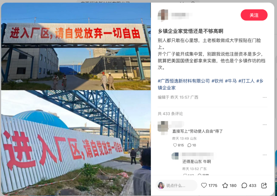 恒逸石化被曝标语“进厂区请放弃一切自由”,网友吐槽
