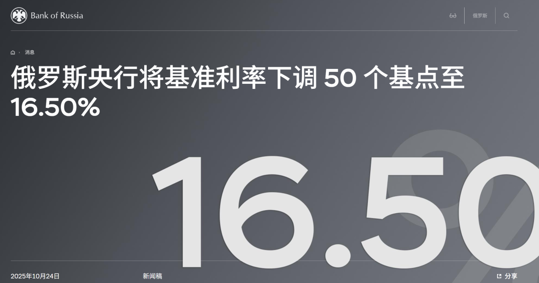 货币政策调整 - 俄罗斯央行将基准利率下调50个基点至16.5%,为连续第四次降息,但降息幅度为本轮周期最小[2] - 决策者预计2026年的关键利率平均水平为13%–15%,此前预测为12%–13%[9] - 央行认为,为实现通胀目标,经季节调整的月度数据需在相当一段时间内保持接近4%的水平[6] 通胀状况与预期 - 俄罗斯央行10月通胀预期维持在12.6%的高位[5] - 通胀一度与央行4%的目标短暂对齐,但随后再度走高,原因包括季节性因素消退、卢布走强效应减弱以及燃料短缺[4] - 央行将2026年的物价涨幅预测从此前的4%上调至4%–5%[4] - 计划于2026年将增值税从20%上调至22%,预计将为居民消费价格涨幅再增加0.6–0.8个百分点[5] 经济增长与财政政策 - 俄罗斯央行将今年国内生产总值增速预期从1%–2%下调至0.5%–1%[4] - 央行警告称,2025年预算的“通胀放缓效应”将显著小于此前预期,财政政策的变化可能需要货币政策作出相应调整[8] - 高利率在难以给企业带来明显宽松的情况下,仍帮助缓解了经济衰退的担忧[6] 外部风险因素 - 美国对俄罗斯最大石油生产商实施的新制裁,可能对俄罗斯经济产生负面影响,并重新点燃硬着陆的风险[7] - 乌克兰对能源基础设施的打击导致燃料短缺,9月汽油价格跃升3%,本月又上涨2%[4]