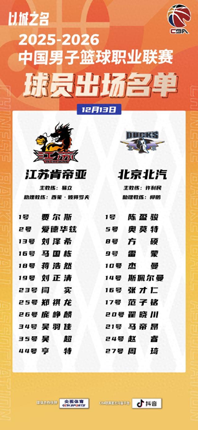 转自:北京日报客户端 12月13日,北京北汽队迎来了本队2025至2026赛季CBA联赛的首场比赛。北汽队在客场以84比74战胜 江苏肯帝亚队,整场比赛过程比较顺利,全队12人出场10人有得分。 北汽队在休赛期召来了国家队队长赵睿,又引进了斯佩尔曼和马帝昂两名外援。在此前的CBA俱乐部 杯上,周琦、赵睿、雷蒙三名国手都没有出赛,这次来到丹阳市迎战江苏队,三人都进入比赛名单。 陈盈骏、赵睿、周琦、斯佩尔曼、杰曼先发出场,周琦的中投成为北汽队本赛季的首次得分。开场2分 半钟,北汽队以10比2领先,赵睿也通过远投有了得分。江苏队主要通过两名外援得分,北汽队则是多 点开花。北汽队在首节尾声打得有些混乱,主教练许利民立刻叫暂停调整。首节结束,北汽队以31比22 领先。北汽队打得灵活多变,人员轮换频繁,但命中率有所下降,对手趁机缩小了分差。北汽队在半场 以47比43领先。 换边后,北汽队再次派出先发5人阵容,又将领先优势扩大到两位数。全队12名球员都获得了出场机 会,三节过后,北汽队以74比60领先。周琦与范子铭组成"双塔"出场,在单外援的末节,江苏队很难掀 起持续的得分高潮。双方都无心恋战,北汽队打得很从容,顺利赢下了 ...