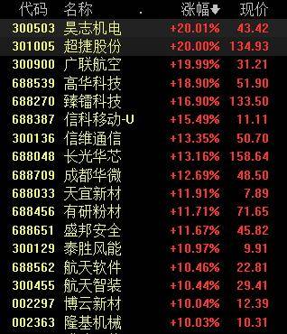 | 代码 | 名称 | 张唱 | 现价 | | --- | --- | --- | --- | | 300503 吴志机电 | | +20.01% | 43.42 | | 301005 超捷股份 | | +20.00% | 134.93 | | 300900 广联航空 | | +19.99% | 31.21 | | 688639 | 高华科技 | +18.90% | 51.90 | | 688270 | 臻镭科技 | +16.90% | 133.50 | | 688387 信科移动-U | | +15.49% | 11.11 | | 300136 信维通信 | | +13.35% | 50.70 | | 688048 | 长光华芯 | +13.16% | 158.64 | | 60Z889 | 成都华微 | +12.69% | 48.50 | | 688033 | 天宜新材 | +11.91% | 7.89 | | 688456 有研粉材 | | +11.71% | 71.65 | | 688651 盛邦安全 | | +11.67% | 45.82 | | 300129 泰胜风能 | | +10.97% | ...
