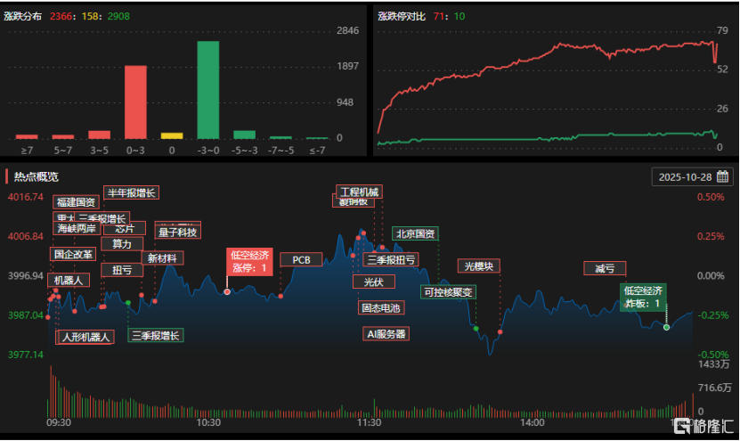 北京商报讯(记者 马换换 王蔓蕾)10月28日,A股三大股指集体低开,开盘后三大股指集体走高翻 红,其中上证综指盘中触及4010.73点的高点,突破4000点整数关口。午后开盘,三大股指集体震荡下 行。截至当日收盘,上证综指、深证成指、创业板指跌幅分别为0.22%、0.44%、0.15%,分别报3988.22 点、13430.1点、3229.58点。 前海开源基金首席经济学家杨德龙表示,4000点不是本轮行情的结束,而是标志着新一轮行情的开始。 当前市场仍然在牛市的上半场。"预计科技牛行情还会延续。本轮牛市有望持续两到三年以上,属于一 轮'慢牛长牛'行情。" 个股方面,A股2366股飘红,其中71股涨停;2908股飘绿,其中10股跌停。 成交金额方面,沪市成交金额9407.61亿元,深市成交金额12070.99亿元,两市合计成交金额2.15万亿 元。 盘面上,船舶制造、京东金融、同步磁阻电机等板块轮番活跃,贵金属、第四代半导体、可燃冰等板块 跌幅居前。 ...