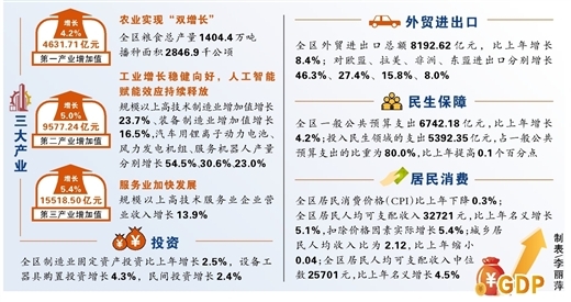 1月26日,自治区统计局联合国家统计局广西调查总队发布2025年广西经济运行数据。根据地区生 产总值统一核算结果,2025年全区生产总值29727.45亿元,按不变价格计算,比上年增长5.1%。 过去一年,全区经济承压前行、加速赶超,高质量发展取得积极成效。经济增速"十四五"期间首次 实现"三个高于"——高于预期目标、高于上年同期、高于全国,排全国第17位、西部第7位,分别比上 年前进8位、3位,扭转了多年来经济增速相对被动的局面。 三大产业 第一产业增加值4631.71亿元增长4.2% 服务业加快发展 规模以上高技术服务业企业营业收入增长13.9% 投资 全区制造业固定资产投资比上年增长2.5%,设备工器具购置投资增长4.3%,民间投资增长2.4% 农业实现"双增长" 全区粮食总产量1404.4万吨 播种面积2846.9千公顷 第二产业增加值9577.24亿元增长5.0% 工业增长稳健向好,人工智能赋能效应持续释放 规模以上高技术制造业增加值增长23.7%、装备制造业增加值增长16.5%,汽车用锂离子动力电 池、风力发电机组、服务机器人产量分别增长54.5%、30.6%、23.0% 第三产业增加值15518 ...