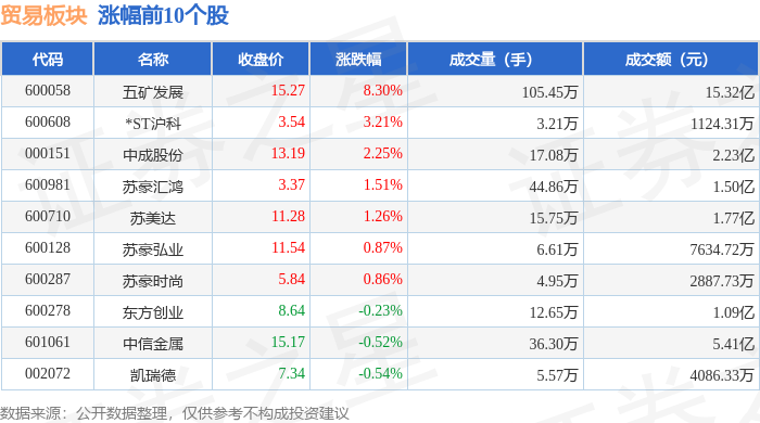| 代码 | 名称 | 收盘价 | 涨跌幅 | 成交量(手) | 成交额(元) | | | --- | --- | --- | --- | --- | --- | --- | | 002183 | 怡亚通 | 4.97 | -1.78% | 59.08万 | | 2.94亿 | | 002091 | 江苏国泰 | 9.29 | -1.17% | 33.44万 | | 3.10亿 | | 600250 | 南京商旅 | 12.03 | -0.82% | 14.92万 | | 1.79亿 | | 002072 | 凯瑞德 | 7.34 | -0.54% | - 5.57万 | | 4086.33万 | | 601061 | 中信金属 | 15.17 | -0.52% | 36.30万 | | 5.41 乙 | | 600278 | 东方创业 | 8.64 | -0.23% | 12.65万 | | 1.09亿 | | 600287 | 赤蒙时尚 | 5.84 | 0.86% | 4.95万 | | 2887.73万 | | 600128 | 亦蒙引业 | 11.54 | 0.87% | 6.61万 | | 763 ...