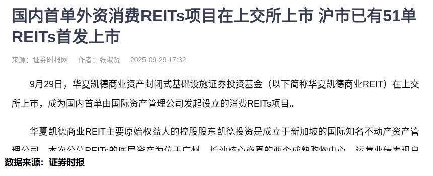 来源:北京日报客户端 记者:孙杰 华夏凯德商业REIT主要原始权益人的控股股东凯德投资是成立于新加坡的国际知名不动产资产管理公 司,基金管理人为华夏基金管理有限公司,专项计划管理人为中信证券股份有限公司。本次公募REITs 的底层资产为位于广州、长沙核心商圈的两个成熟购物中心,建筑面积合计约16.84万平方米,运营业 绩表现良好,2024年项目公司营业收入合计为25196.24万元。 华夏凯德商业REIT基金份额4亿份,发售价格5.718元/份,募集资金总额22.872亿元。项目回收资金主要 用于中国境内优质资产建设和收购,对提升消费供给效能,提振和扩大消费发挥积极作用。凯德投资在 中国18个城市管理40多个零售物业,资产规模超800亿元人民币,为REITs产品未来扩募提供了丰富的 资产储备。 截至目前,上交所共有51单REITs首发上市,融资规模达1343.90亿元,资产类型不断拓展,参与主体更 为多元,投资者类型更加丰富,已形成良好规模效应和示范效应。 9月29日,华夏凯德商业资产封闭式基础设施证券投资基金(简称华夏凯德商业REIT)在上交所上市, 成为国内首单由国际资产管理公司发起设立的消费REITs项 ...