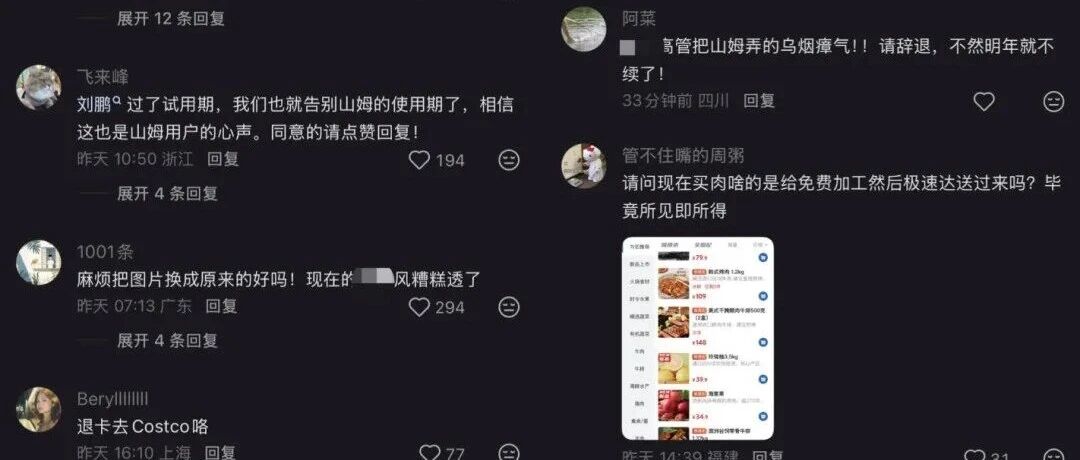 近日,山姆APP商品页 使用AI图、包装上部分信息被打码 等问题引发争议,相关话题登上热搜。 11月3日晚,山姆发布相关声明称, 本次APP的改动于今年8月底开始上线进行测试,并在期间持续根据会员的反馈进行优化。这两天陆续 收到了更多来自会员关于商品图片等方面的宝贵建议,将会持续改进,以更好地展现商品的真实形态并提升体验。 据蓝鲸新闻此前报道,近日,大量山姆会员反映,更新后的山姆App出现 图片过度美化、配料表被隐藏、交互界面繁琐 等问题。 在山姆的社交媒体和app评论区,"退卡、差评"等类似的评论正在持续刷屏。 | 共 266 条评论 = | | × | 共 266 条评论 = | | × | | --- | --- | --- | --- | --- | --- | | 霸王龙怒吼 | | | 昨天 12:45 中国香港 回复 | (7 63 | (=) | | 辞过 ■■管,否则不续卡 | | | 展开 4 条回复 | | | | 昨天 08:33 上海 回复 | 2 367 | (=) | | | | | 展开 12 条回复 | | | 阿菜 | | | | | | | 写管把山姆弄的乌烟瘴气!!请辞 ...