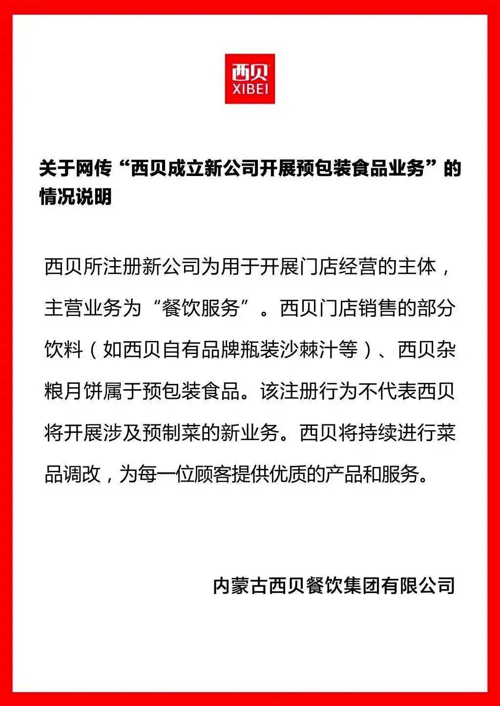 公司新设实体与业务范围 - 内蒙古西贝餐饮集团有限公司控股95%的深圳市玉华美好餐饮管理有限公司于9月30日成立 [1] - 新公司经营范围为预包装食品销售和食品互联网销售等领域 [1] - 西贝集团声明新公司为用于开展门店经营的主体,主营业务为餐饮服务,不代表将开展预制菜新业务 [1] - 西贝门店销售的部分自有品牌饮料和杂粮月饼属于预包装食品 [1] 预制菜风波与市场影响 - 连锁餐饮集团西贝此前陷入预制菜舆论风波 [1] - 西贝创始人贾国龙表示公司此前做过预制菜(功夫菜),但很早店里就不卖了,目前有一个在线上卖的西北放心早餐 [1] - 西贝与罗永浩之间围绕预制菜的争议对西贝门店经营产生不小的负面影响 [4] - 9月10日和11日,西贝所有门店日营业额分别减少100万元,12日预计减少200万元至300万元 [5] 公司应对措施与战略调整 - 9月15日,西贝发布公开信致歉,承认生产工艺与顾客期望有较大差异,将尽可能把中央厨房前置加工工艺调整到门店现场加工 [5] - 在10月1日前,西贝全国门店陆续完成九个项目的调整,包括调整用油、儿童餐牛肉焖饭牛肉酱和牛肉饼改为门店现制等 [5] - 西贝自9月24日起在全国门店发起西贝请您吃饭活动,向到店顾客免费发放100元堂食代金券 [5] - 10月1日西贝全国门店对菜品进行大幅调价,本轮降价涉及33道菜,部分菜品降价超过20% [5] - 西贝将持续进行菜品调改,为顾客提供优质产品和服务 [1]