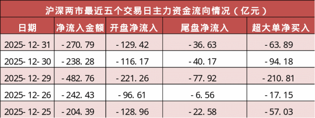 市场整体表现 - 2025年12月31日A股主要股指涨跌互现,上证指数收报3968.84点,上涨0.09%,深证成指收报13525.02点,下跌0.58%,创业板指收报3203.17点,下跌1.23% [1] - 两市合计成交额为20451.42亿元,较上一交易日减少971.83亿元 [1] 主力资金流向 - 沪深两市全天主力资金净流出270.79亿元,其中开盘净流出129.42亿元,尾盘净流出36.63亿元 [2] - 最近五个交易日(12月25日至12月31日),两市主力资金持续净流出,净流出额分别为204.39亿元、242.43亿元、482.76亿元、238.28亿元和270.79亿元 [3] - 分板块看,沪深300指数成分股当日主力资金净流出143.37亿元,创业板净流出119.46亿元,科创板净流出0.68亿元 [4] - 最近五个交易日,沪深300主力资金净流出波动较大,12月30日曾录得净流入3.75亿元,其余交易日均为净流出 [5] - 最近五个交易日,创业板主力资金持续净流出,净流出额在51.51亿元至183.32亿元之间 [5] 行业资金流向 - 国防军工行业当日涨幅为2.15%,获得主力资金净流入71.70亿元,成为净流入最多的行业 [7] - 传媒行业当日涨幅1.48%,获得主力资金净流入57.79亿元 [7] - 计算机行业当日涨幅1.32%,获得主力资金净流入44.61亿元 [7] - 电子行业当日下跌0.23%,遭遇主力资金净流出192.80亿元,成为净流出最多的行业 [7] - 电力设备行业当日下跌0.52%,遭遇主力资金净流出118.33亿元 [7] - 通信行业尽管当日大幅上涨7.01%,但仍遭遇主力资金净流出60.94亿元 [7] 机构交易动态 - 根据龙虎榜数据,机构净买入额居前的个股包括:御银股份(净买入16713.25万元,日涨跌幅10.06%)、天奇股份(净买入11247.47万元,日涨跌幅-3.46%)、久之洋(净买入10968.62万元,日涨跌幅20.00%) [11] - 机构净卖出额居前的个股包括:航天发展(净卖出31837.46万元,日涨跌幅10.00%)、顺灏股份(净卖出8374.60万元,日涨跌幅10.02%)、合兴包装(净卖出5931.41万元,日涨跌幅-9.94%) [11] 机构最新研究观点 - 国泰海通给予圆特维“增持”评级,目标价66.59元,较最新收盘价45.26元有47.13%的上涨空间 [13] - 国泰海通给予能京啤酒“增持”评级,目标价17.75元,较最新收盘价11.23元有58.06%的上涨空间 [13] - 国投证券给予淮河能源“买入”评级,目标价4.6元,较最新收盘价3.40元有35.29%的上涨空间 [13] - 申万宏源给予中国平安“买入”评级,目标价93.8元,较最新收盘价68.40元有37.13%的上涨空间 [13] - 国泰海通给予电科数字“增持”评级,目标价41.35元,较最新收盘价29.64元有39.51%的上涨空间 [13] - 华创证券给予格力电器“强推”评级,目标价49.7元,较最新收盘价40.22元有23.57%的上涨空间 [13]